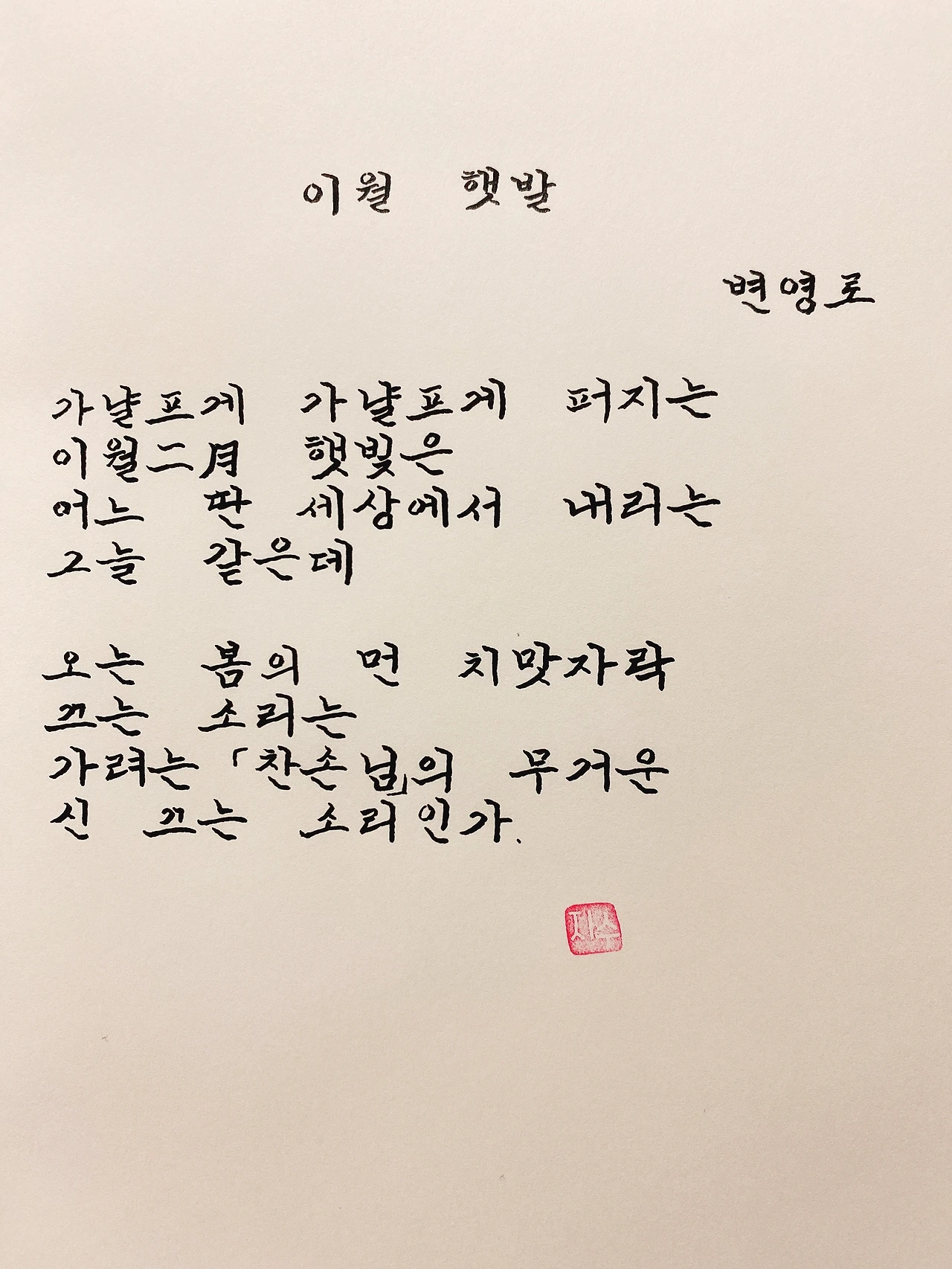 평범한 직장인. 사내 동호회를 통해 매일 한편 손으로 시 읽기를 시작한 이후로, 매일 시 한편을 필사 합니다. 필사한 시가 저작권에 문제가 된다면 말씀해주세요.