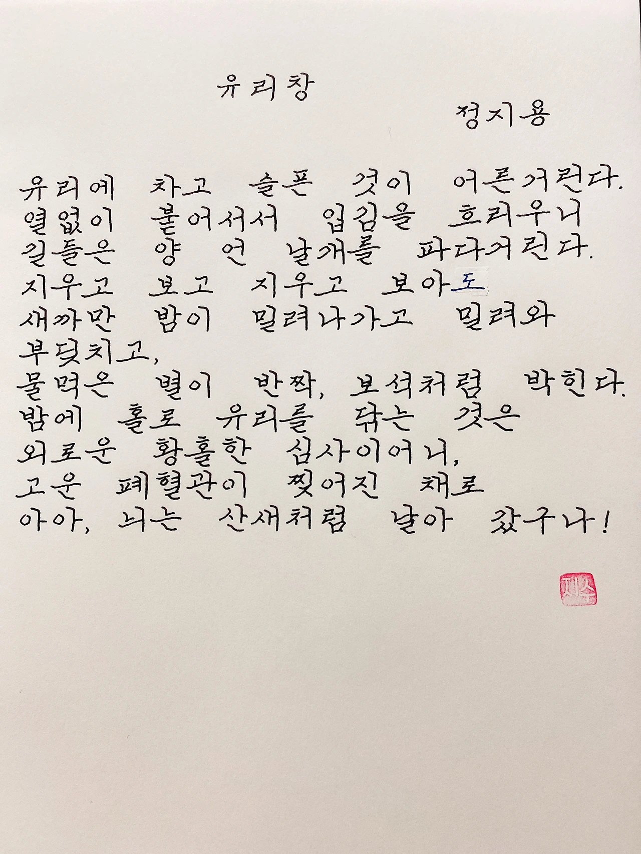 평범한 직장인. 사내 동호회를 통해 매일 한편 손으로 시 읽기를 시작한 이후로, 매일 시 한편을 필사 합니다. 필사한 시가 저작권에 문제가 된다면 말씀해주세요.