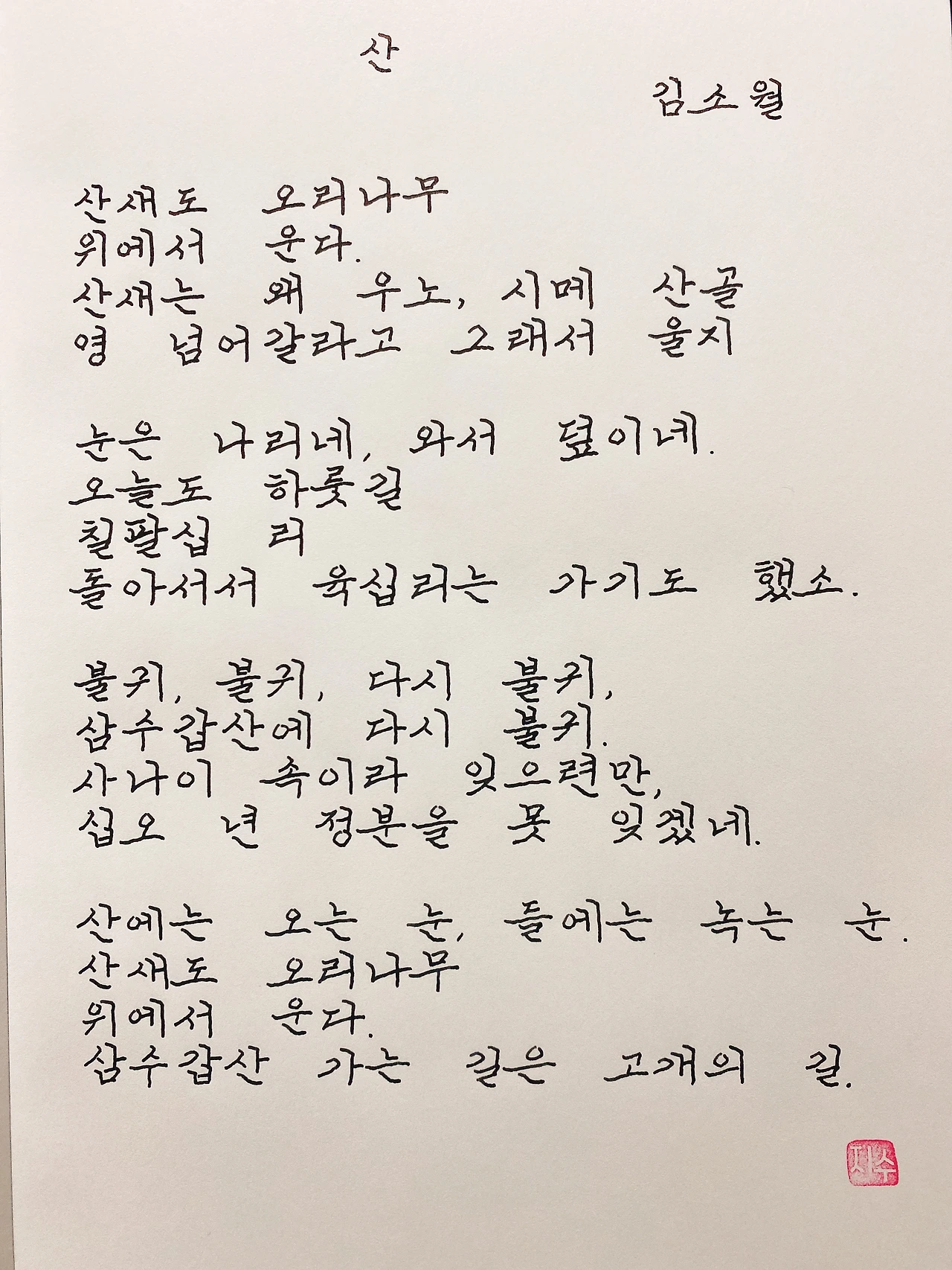 평범한 직장인. 사내 동호회를 통해 매일 한편 손으로 시 읽기를 시작한 이후로, 매일 시 한편을 필사 합니다. 필사한 시가 저작권에 문제가 된다면 말씀해주세요.