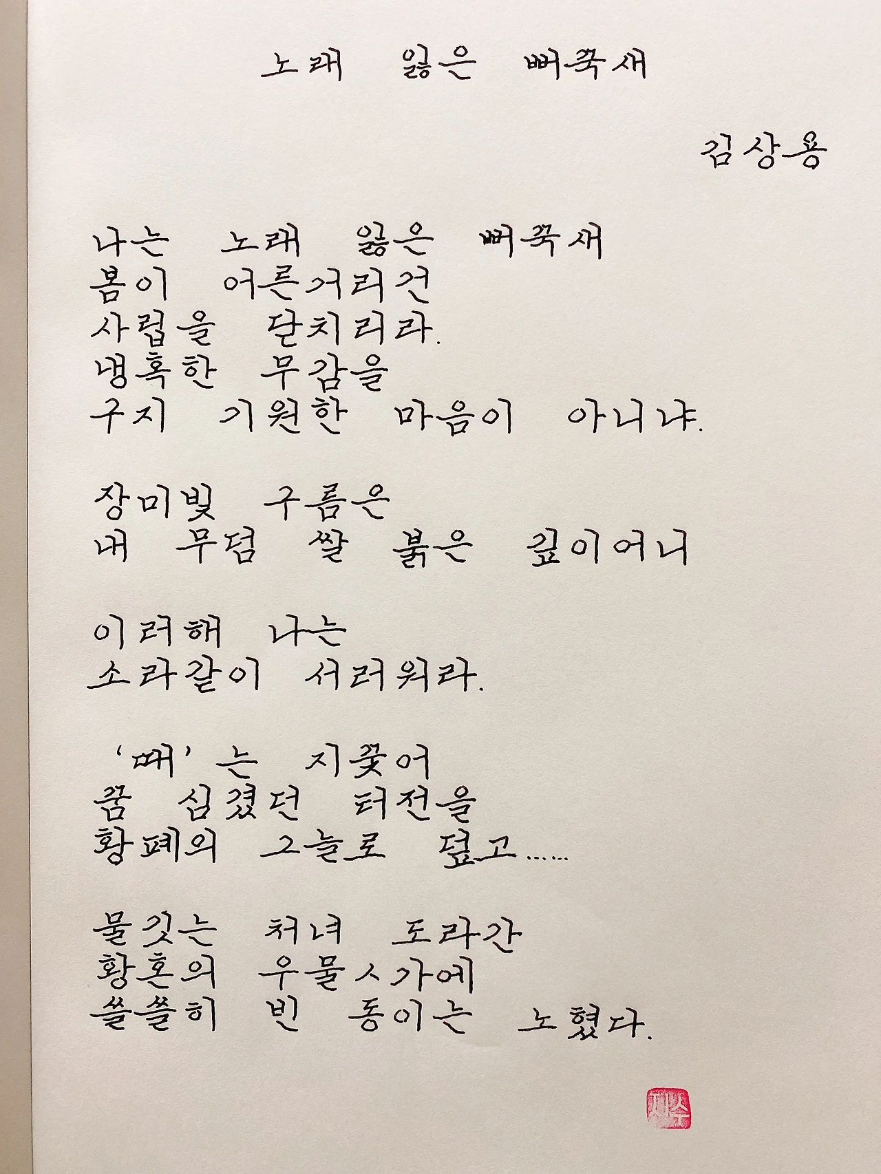 평범한 직장인. 사내 동호회를 통해 매일 한편 손으로 시 읽기를 시작한 이후로, 매일 시 한편을 필사 합니다. 필사한 시가 저작권에 문제가 된다면 말씀해주세요.