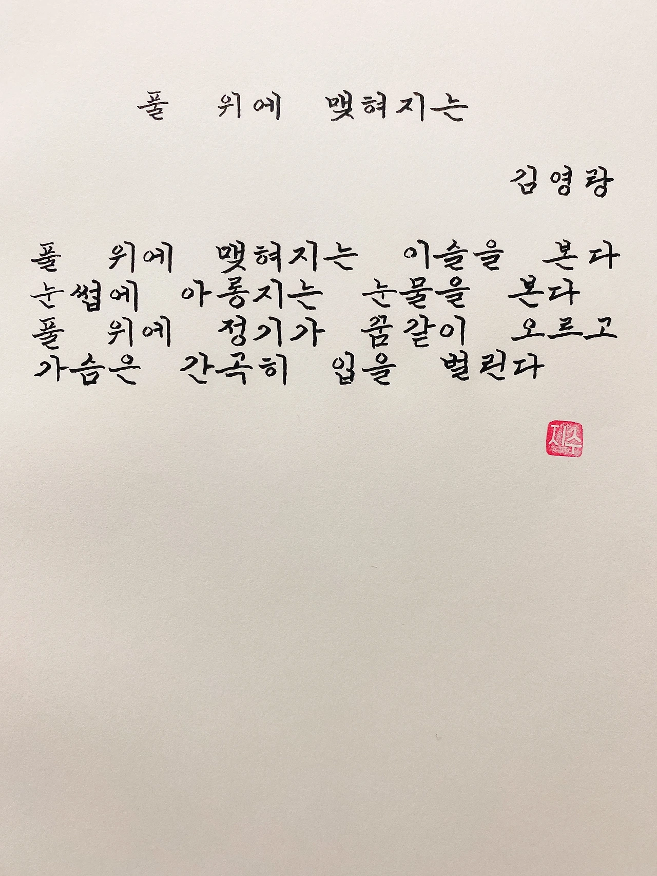 평범한 직장인. 사내 동호회를 통해 매일 한편 손으로 시 읽기를 시작한 이후로, 매일 시 한편을 필사 합니다. 필사한 시가 저작권에 문제가 된다면 말씀해주세요.