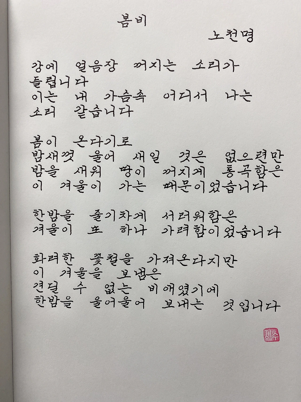 평범한 직장인. 사내 동호회를 통해 매일 한편 손으로 시 읽기를 시작한 이후로, 매일 시 한편을 필사 합니다. 필사한 시가 저작권에 문제가 된다면 말씀해주세요.
