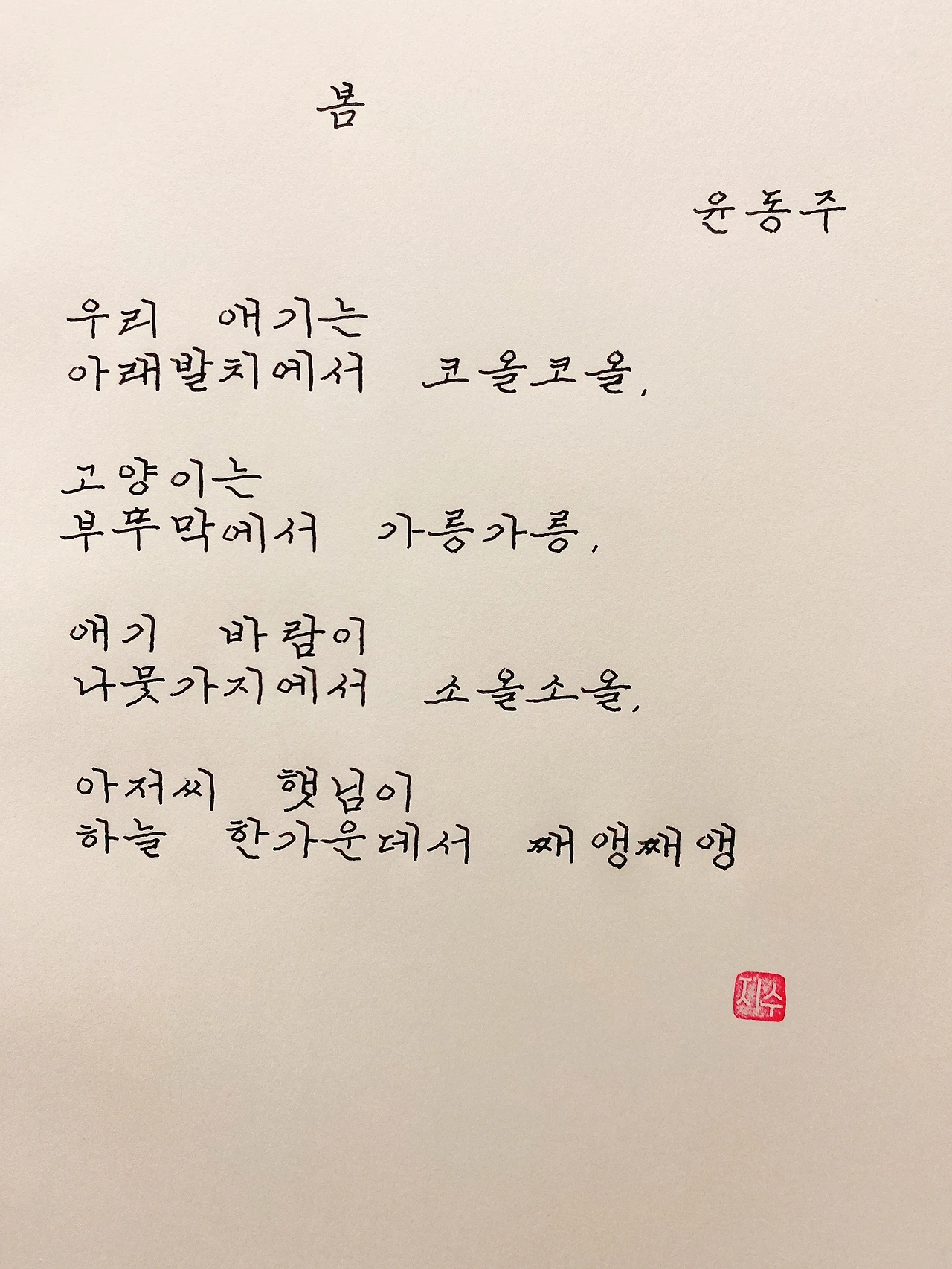 평범한 직장인. 사내 동호회를 통해 매일 한편 손으로 시 읽기를 시작한 이후로, 매일 시 한편을 필사 합니다. 필사한 시가 저작권에 문제가 된다면 말씀해주세요.