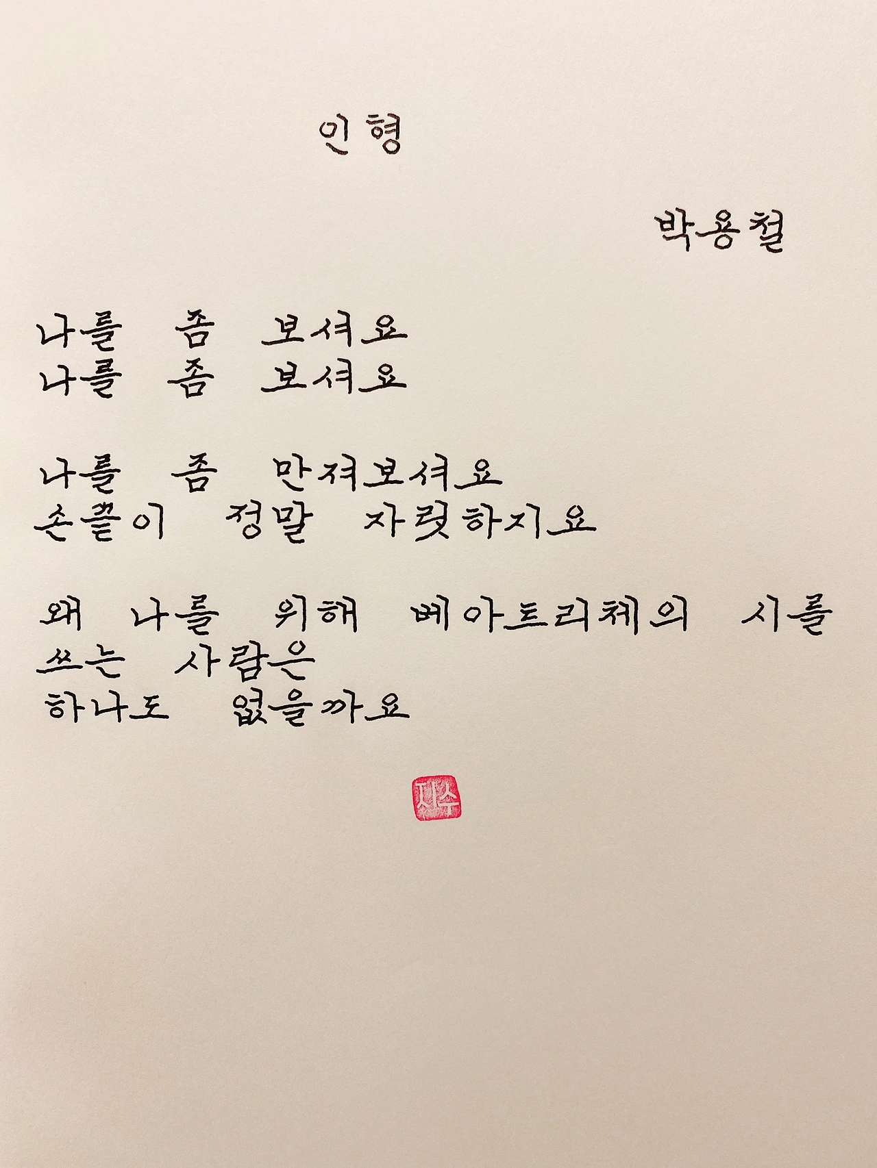 평범한 직장인. 사내 동호회를 통해 매일 한편 손으로 시 읽기를 시작한 이후로, 매일 시 한편을 필사 합니다. 필사한 시가 저작권에 문제가 된다면 말씀해주세요.