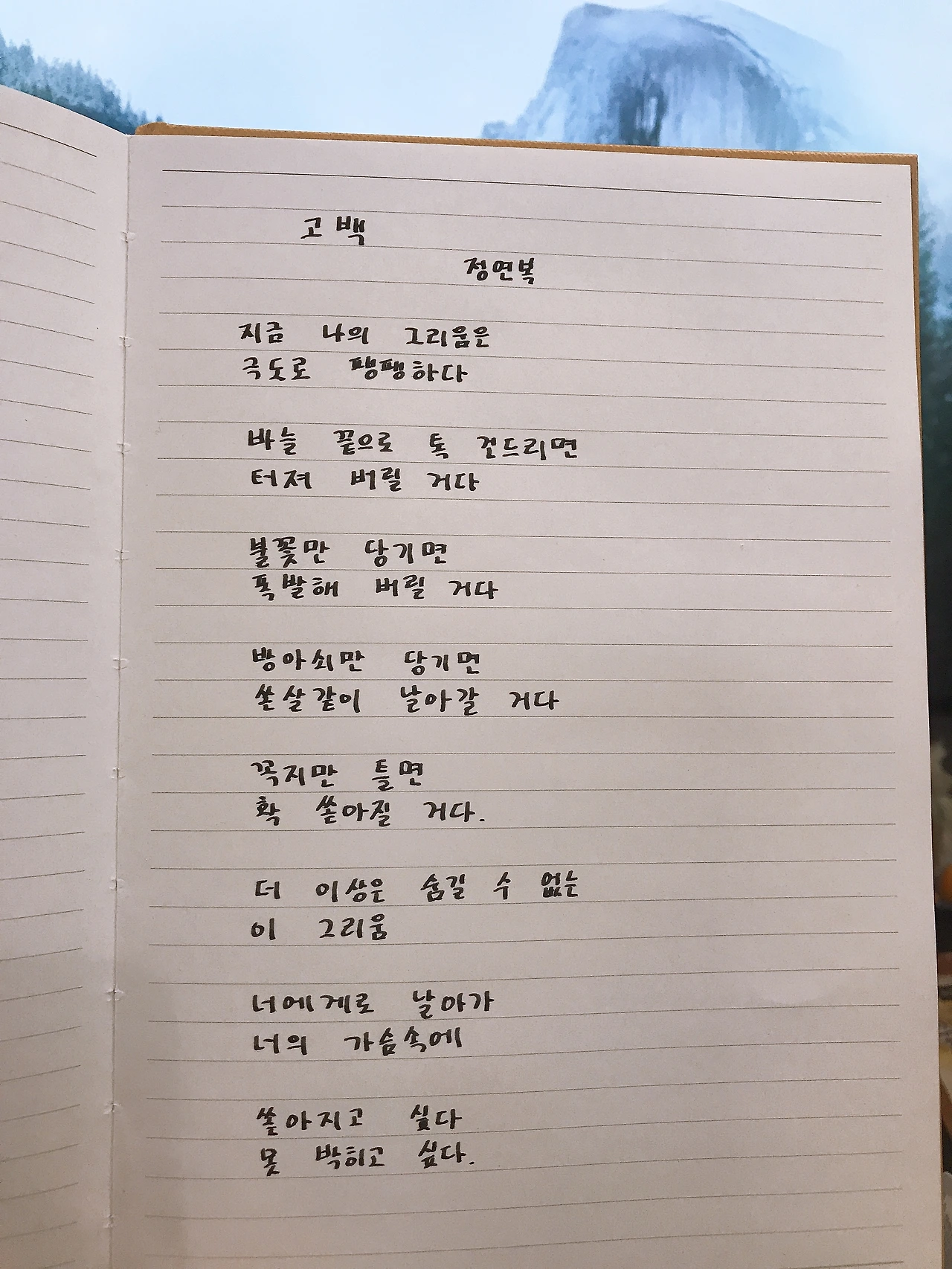 [0321] 고백 by 정연복지금 나의 그리움은극도로 팽팽하다바늘 끝으로 톡 건드리면 터져 버릴 거다불꽃만 당기면폭발해 버릴 거다방아쇠만 당기면쏜살같이 날아갈 거다꼭지만 틀면 확 쏟아질 거다.더 이상은 숨길 수 없는이 그리움너에게로 날아가너의 가슴속에쏟아지고 싶다못 박히고 싶다.