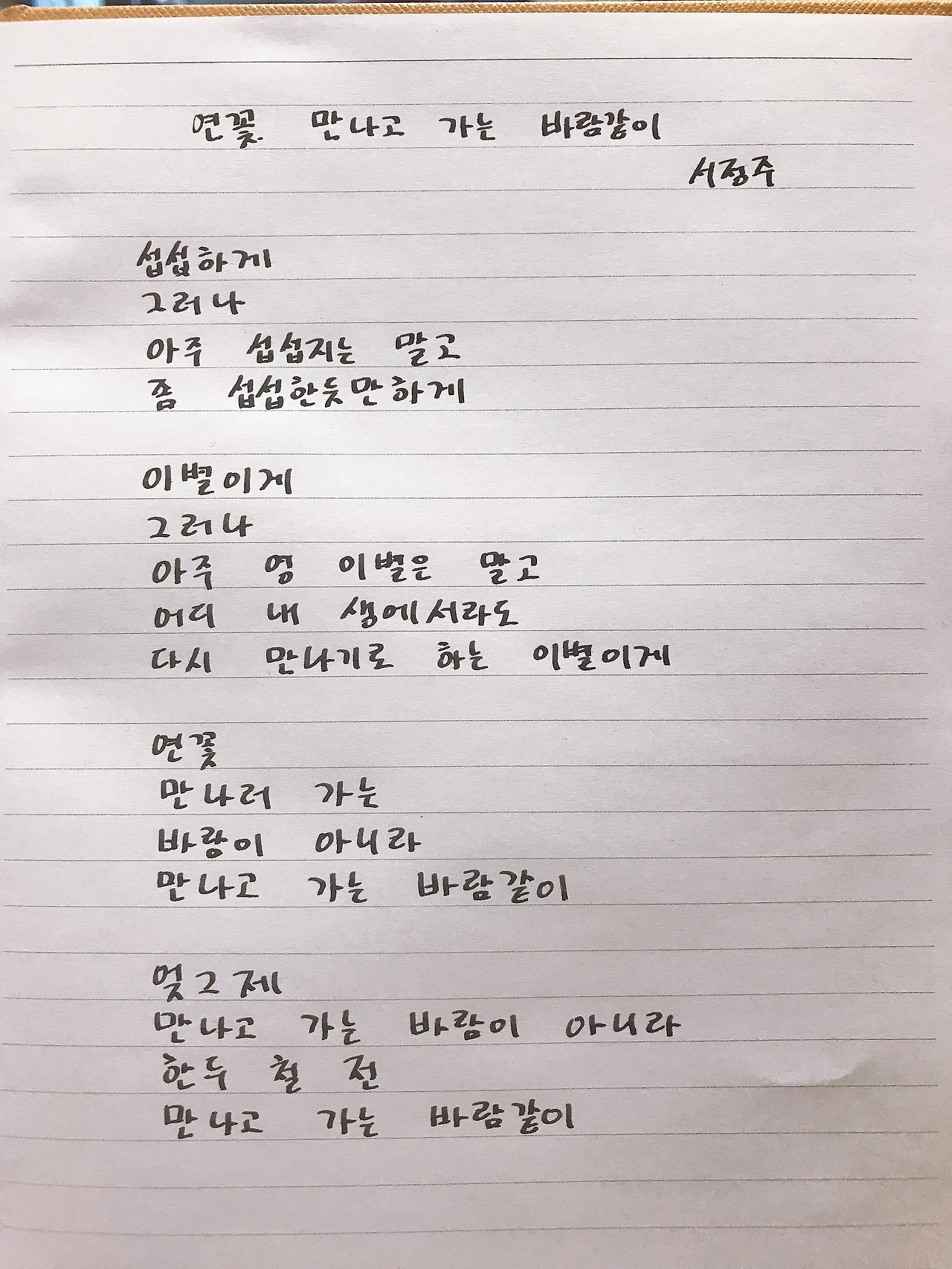 [0324] 연꽃 만나고 가는 바람같이 by 서정주섭섭하게 그러나 아주 섭섭지는 말고좀 섭섭한듯만하게 이별이게 그러나 아주 영 이별은 말고 어디 내 생에서라도 다시 만나기로 하는 이별이게 연꽃 만나러 가는 바람이 아니라 만나고 가는 바람같이 엊그제 만나고 가는 바람이 아니라 한두 철 전 만나고 가는 바람같이