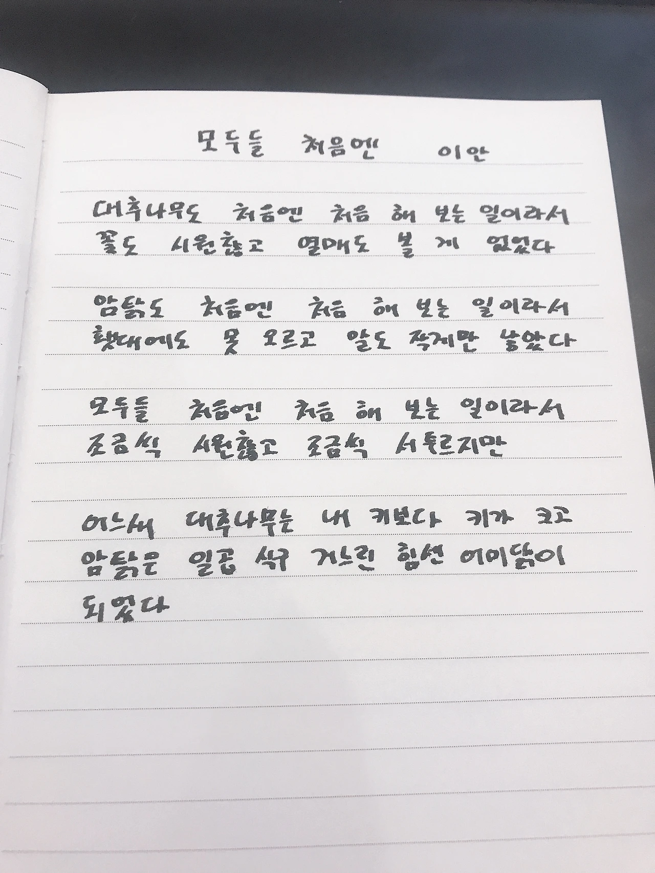 [0330] 모두들 처음엔 - 이안대추나무도 처음엔 처음 해 보는 일이라서꽃도 시원찮고 열매도 볼 게 없었다암탉도 처음엔 처음 해 보는 일이라서횃대에도 못 오르고 알도 작게만 낳았다모두들 처음엔 처음 해 보는 일이라서조금씩 시원찮고 조금씩 서투르지만어느새 대추나무는 내 키보다 키가 크고암탉은 일곱 식구 거느린 힘센 어미닭이 되었다