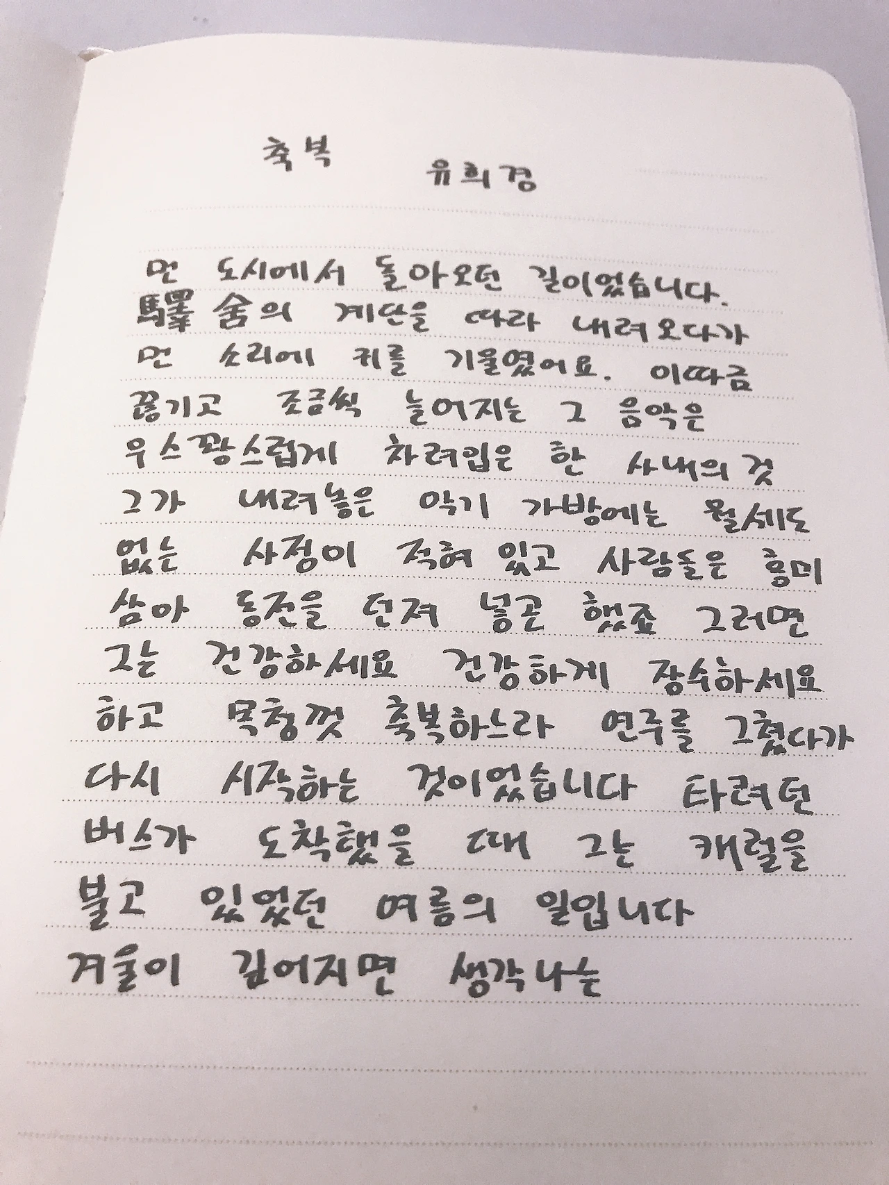 먼 도시에서 돌아오던 길이었습니다 驛舍의 계단을 따라 내려오다가 먼 소리에 귀를 기울였어요. 이따금 끊기고 조금씩 늘어지는 그 음악은 우스꽝스럽게 차려입은 한 사내의 것 그가 내려놓은 악기 가방에는 월세도 없는 사정이 적혀 있고 사람들은 흥미 삼아 동전을 던져 넣곤 했죠 그러면 그는 건강하세요 건강하게 장수하세요 하고 목청껏 축복하느라 연주를 그쳤다가 다시 시작하는 것이었습니다 타려던 버스가 도착했을 때 그는 캐럴을 불고 있었던 여름의 일입니다 겨울이 깊어지면 생각나는