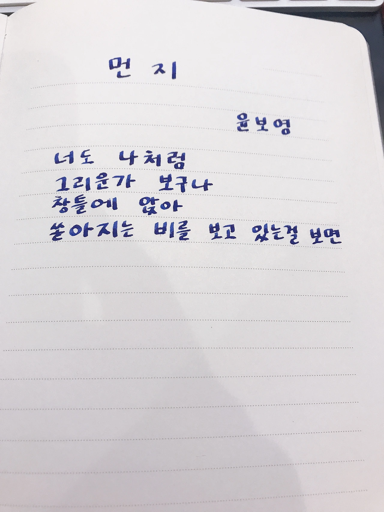 [0730] 먼지 - 윤보영너도 나처럼그리운가 보구나창틀에 앉아쏟아지는 비를 보고 있는걸 보면.