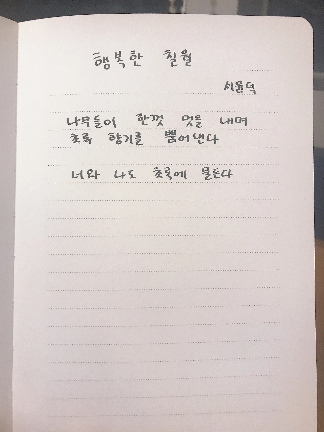 행복한 칠월서윤덕나무들이 한껏 멋을 내며초록 향기를 뿜어낸다너와 나도 초록에 물든다