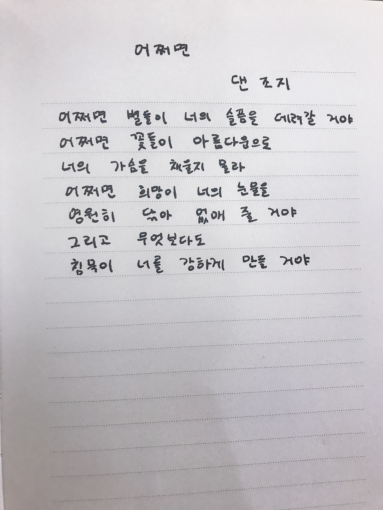 어쩌면- 댄 조지어쩌면 별들이 너의 슬픔을 데려갈 거야어쩌면 꽃들이 아름다움으로너의 가슴을 채울지 몰라어쩌면 희망이 너의 눈물을영원히 닦아 없애 줄 거야그리고 무엇보다도침묵이 너를 강하게 만들 거야