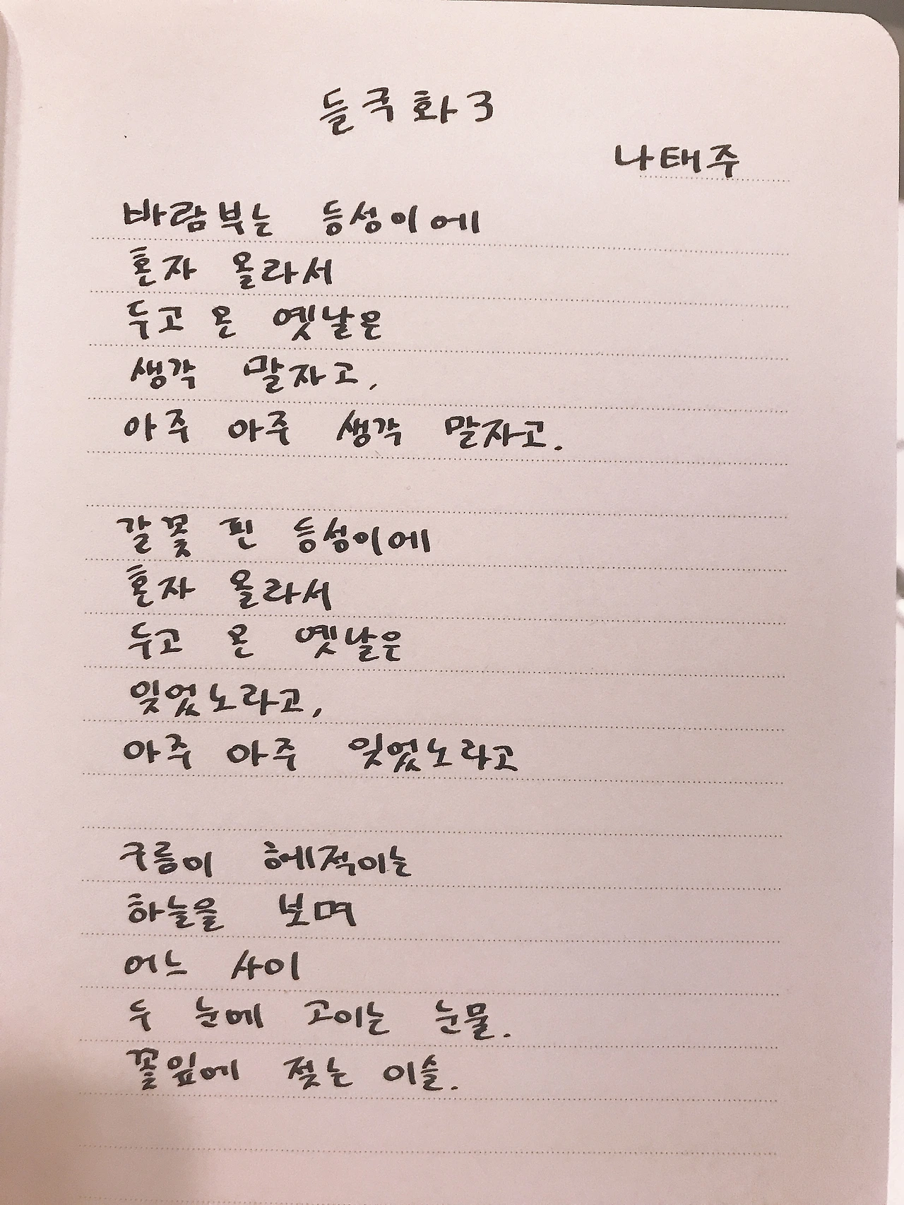 들국화3 - 나태주바람 부는 등성이에혼자 올라서두고 온 옛날은생각 말자고,아주 아주 생각 말자고.갈꽃 핀 등성이에혼자 올라서두고 온 옛날은잊었노라고,아주 아주 잊었노라고구름이 헤적이는하늘을 보며어느 사이두 눈에 고이는 눈물.꽃잎에 젖는 이슬.