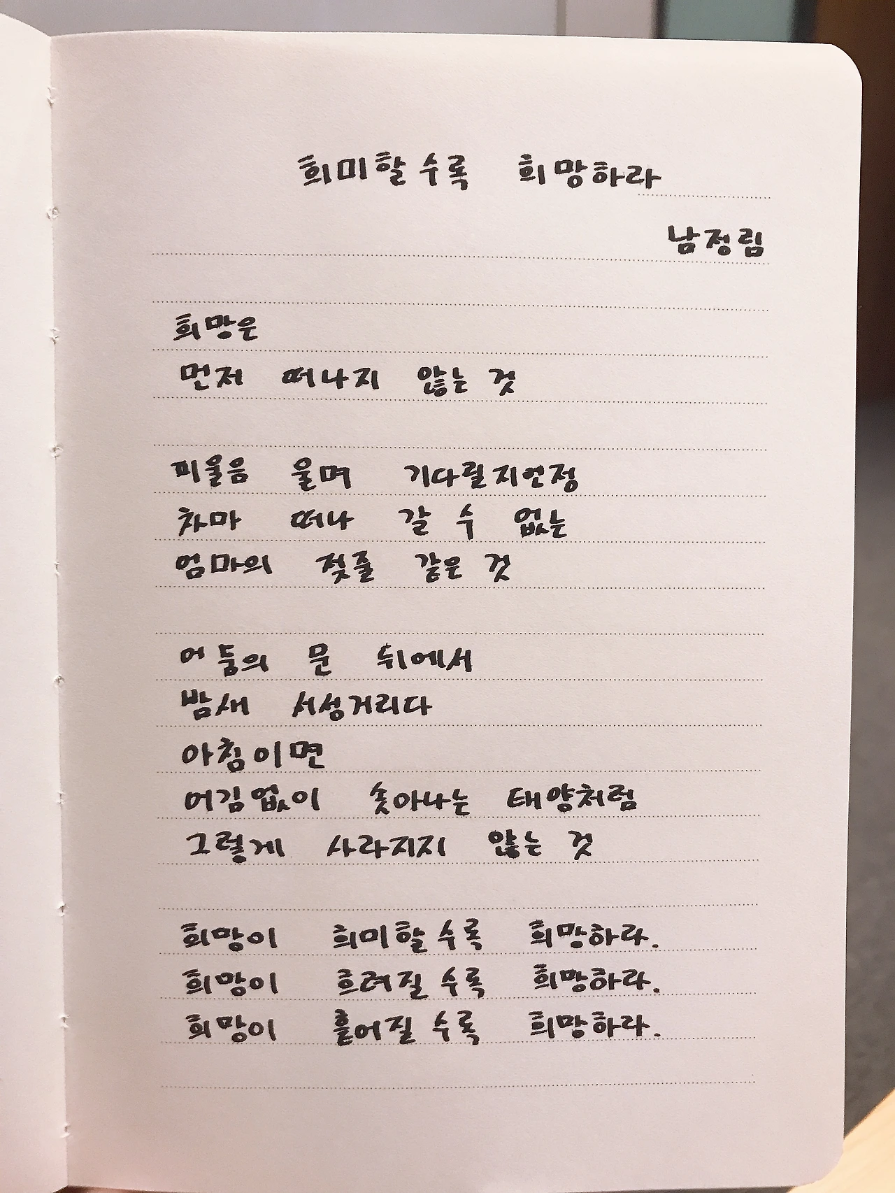 [0914] 희미할수록 희망하라/남정림희망은먼저 떠나지 않는 것피울음 울며 기다릴지언정차마 떠나 갈 수 없는엄마의 젖줄 같은 것어둠의 문 뒤에서 밤새 서성거리다아침이면 어김없이 솟아나는 태양처럼그렇게 사라지지 않는 것희망이 희미할수록 희망하라. 희망이 흐려질수록 희망하라.희망이 흩어질수록 희망하라.