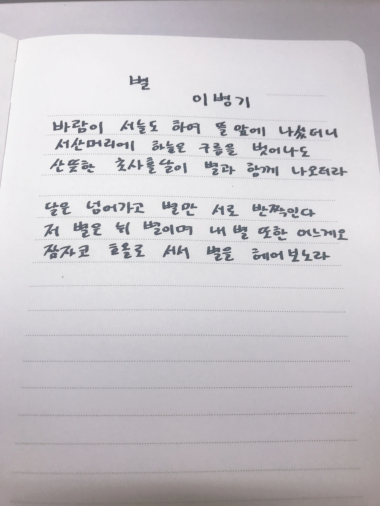 [0916] 별 by 이병기바람이 서늘도 하여 뜰 앞에 나섰더니서산머리에 하늘은 구름을 벗어나도산뜻한 초사흘달이 별과 함께 나오더라달은 넘어가고 별만 서로 반짝인다저 별은 뉘 별이며 내 별 또한 어느게오잠자코 호올로 서서 별을 헤어보노라