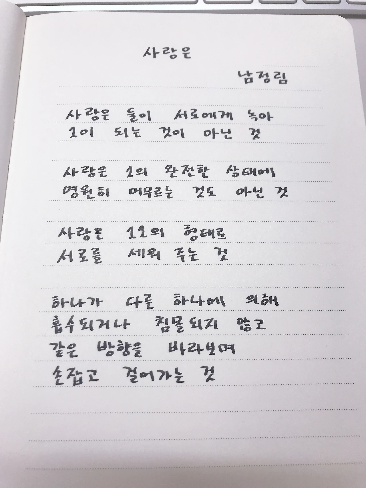 사랑은 by 남정림사랑은 둘이 서로에게 녹아 1이 되는 것이 아닌 것사랑은 1의 완전한 상태에영원히 머무르는 것도 아닌 것사랑은 11의 형태로 서로를 세워 주는 것하나가 다른 하나에 의해흡수되거나 침몰되지 않고같은 방향을 바라보며 손잡고 걸어가는 것