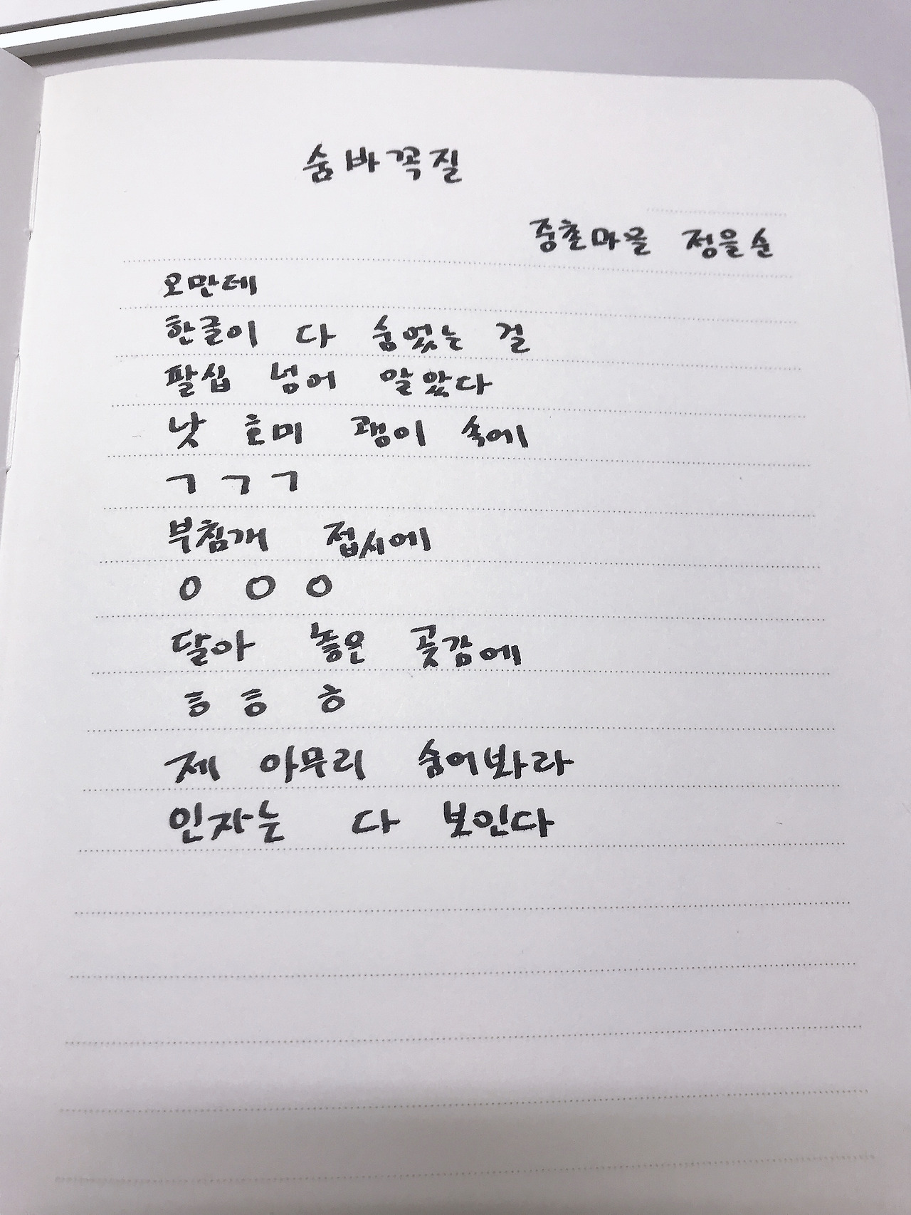 [0924] 숨바꼭질 - 중촌마을 정을순오만데한글이 다 숨었는 걸팔십 넘어 알았다낫 호미 괭이 속에ㄱ ㄱ ㄱ부침개 접시에ㅇ ㅇ ㅇ달아 놓은 곶감에ㅎ ㅎ ㅎ제아무리 숨어봐라인자는 다 보인다