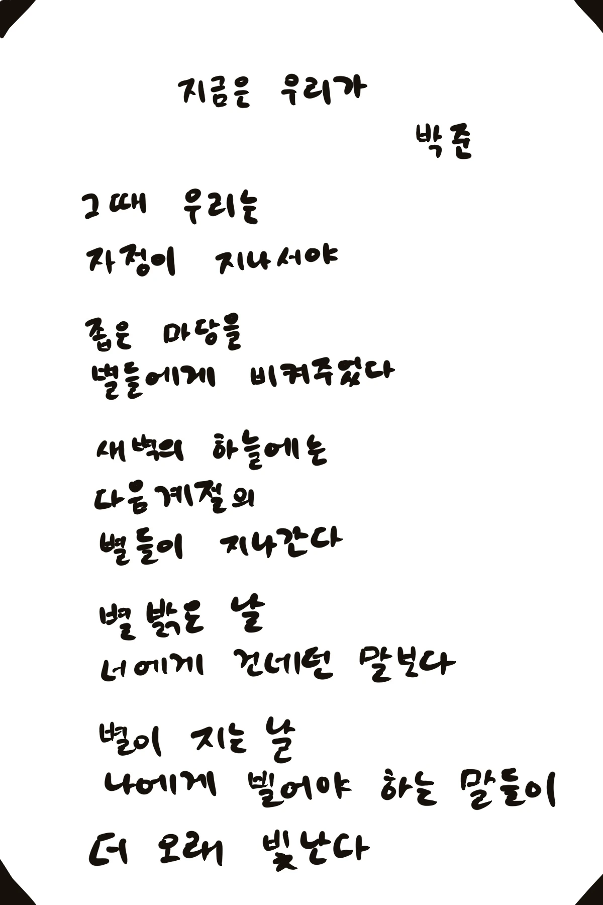 [1003] 지금은 우리가 - 박 준그때 우리는자정이 지나서야좁은 마당을별들에게 비켜주었다새벽의 하늘에는다음 계절의별들이 지나간다별 밝은 날너에게 건네던 말보다별이 지는 날나에게 빌어야 하는 말들이더 오래 빛난다