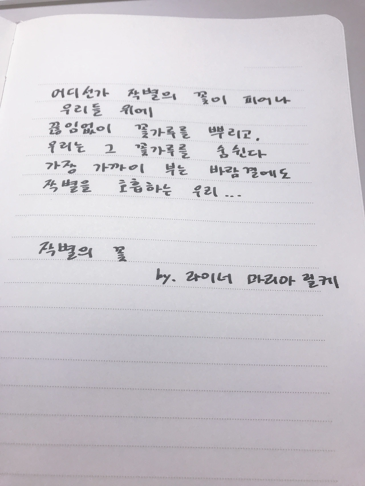 [1008] 작별의 꽃 by. 라이너 마리아 릴케어디선가 작별의 꽃이 피어나 우리들 위에끊임없이 꽃가루를 뿌리고, 우리는 그 꽃가루를 숨 쉰다가장 가까이 부는 바람결에도 작별을 호흡하는 우리...