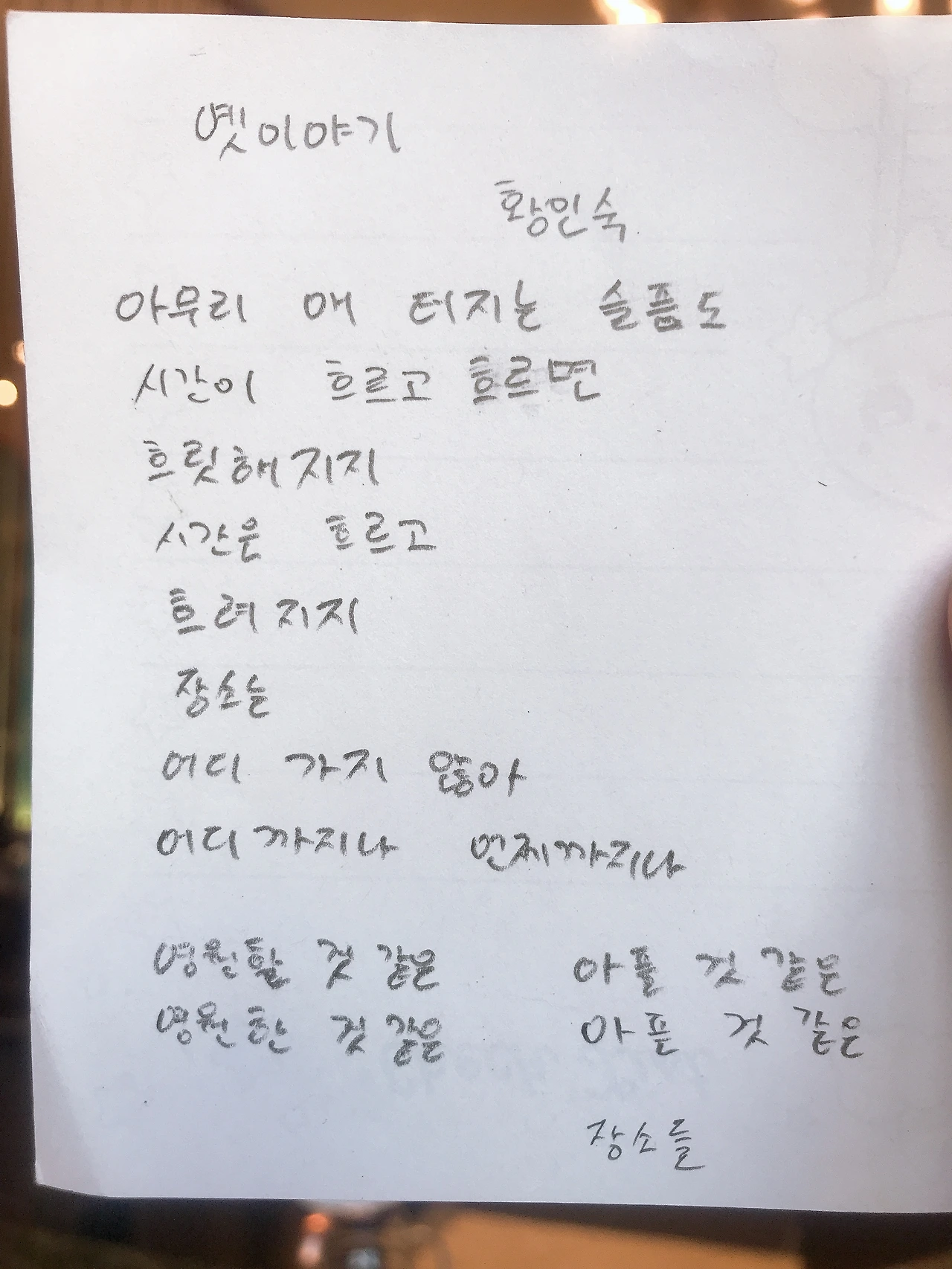 [1009] 옛이야기 by 황인숙 아무리 애 터지는 슬픔도시간이 흐르고 흐르면흐릿해지지시간은 흐르고흐려지지장소는어디 가지 않아어디까지나 언제까지나 영원할 것 같은영원한 것 같은아플 것 같은아픈 것 같은 장소들
