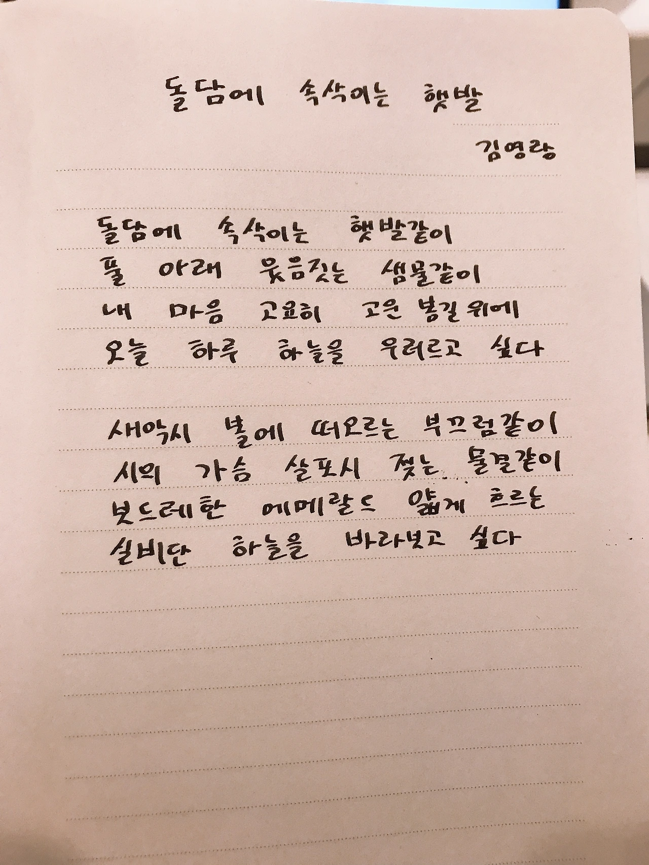 [1014] 돌담에 속삭이는 햇발 - 김영랑 돌담에 속삭이는 햇발같이풀 아래 웃음짓는 샘물같이내 마음 고요히 고운 봄길 위에오늘 하루 하늘늘 우러르고 싶다 새악시 볼에 떠오르는 부끄럼같이시의 가슴 살포시 젖는 물결같이보드레한 에메랄드 얇게 흐르는실비단 하늘을 바라보고 싶다