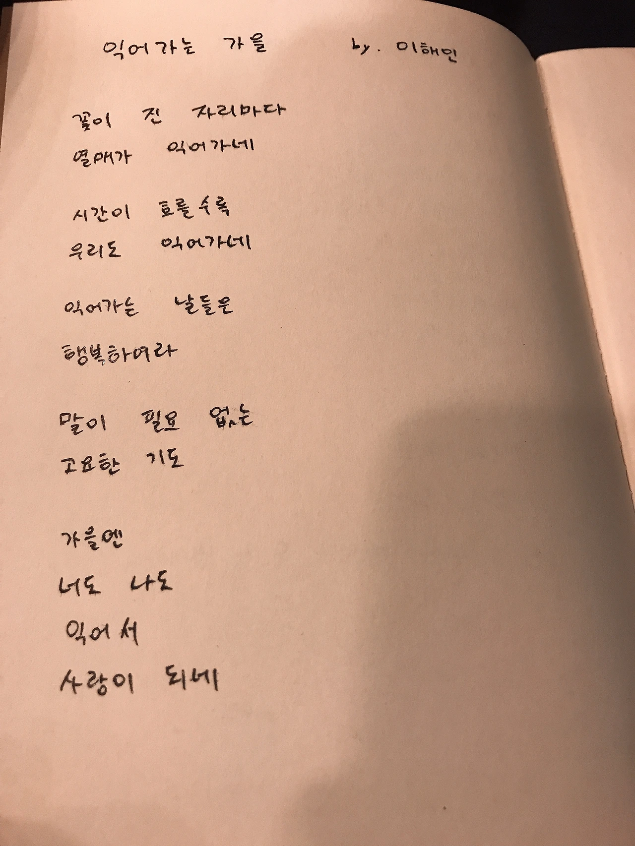 [1020] 익어가는 가을 by 이해인꽃이 진 자리마다열매가 익어가네 시간이 흐를수록우리도 익어가네 익어가는 날들은행복하여라 말이 필요 없는고요한 기도 가을엔너도 나도익어서사랑이 되네