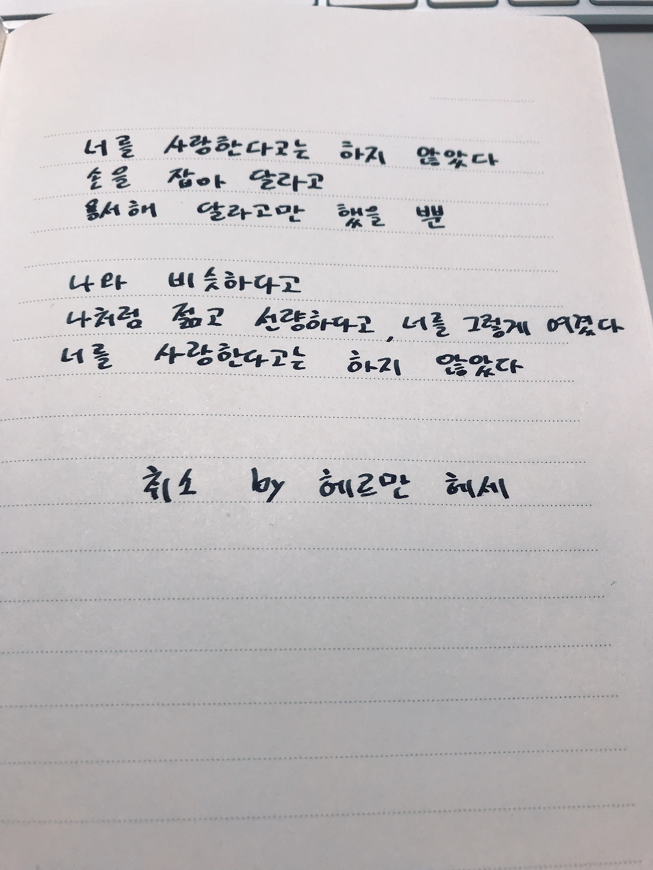 [1023] 취소 By 헤르만 헤세너를 사랑한다고는 하지 않았다손을 잡아 달라고용서해 달라고만 했을 뿐 나와 비슷하다고나처럼 젊고 선량하다고, 너를 그렇게 여겼다너를 사랑한다고는 하지 않았다
