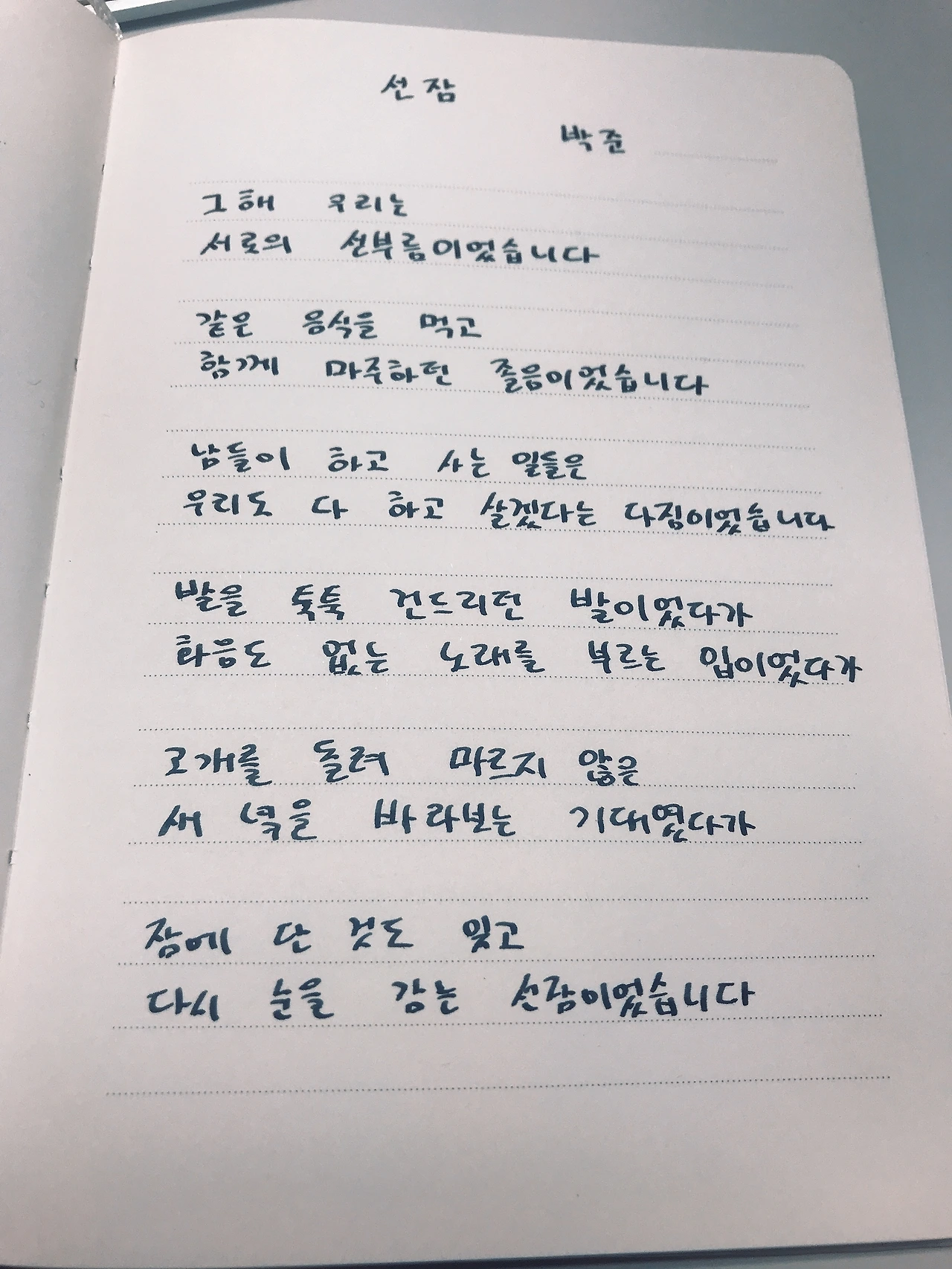 [1024] 선잠 by 박 준그해 우리는서로의 섣부름이었습니다 같은 음식을 먹고함께 마주하던 졸음이었습니다 남들이 하고 사는 일들은우리도 다 하고 살겠다는 다짐이었습니다 발을 툭툭 건드리던 발이었다가화음도 없는 노래를 부르는 입이었다가 고개를 돌려 마르지 않은 새 녘을 바라보는 기대였다가 잠에 단 것도 잊고다시 눈을 감는 선잠이었습니다