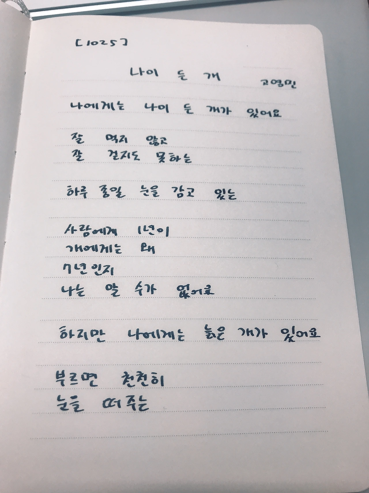 [1025] 나이 든 개 by 고영민나에게는 나이 든 개가 있어요잘 먹지 않고잘 걷지도 못하는하루 종일 눈을 감고 있는사람에게 1년이개에게는 왜7년인지나는 알 수가 없어요하지만 나에게는 늙은 개가 있어요부르면 천천히 눈을 떠주는