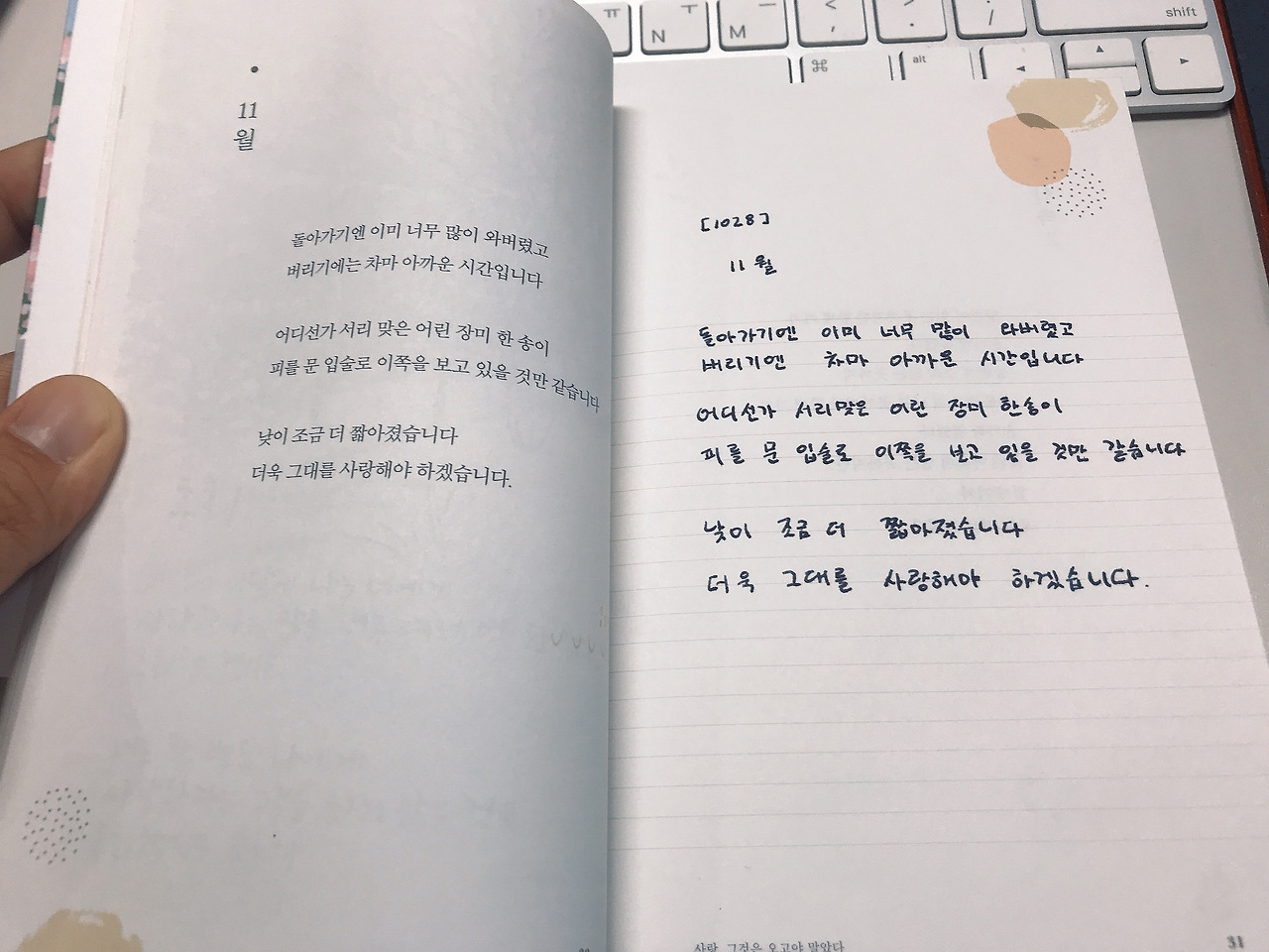 11월 by 나태주돌아가기엔 이미 많이 와버렸고버리기에는 차마 아까운 시간입니다어디선가 서리맞은 어린 장미 한송이피를 문 입술로 이쪽을 보고 있을 것만 같습니다낮에 조금 더 짧아졌습니다더욱 그대를 사랑해야 하겠습니다.