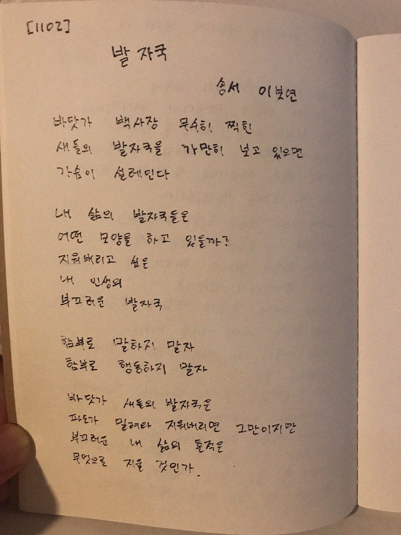 [1102] 발자국 / 송서 이보연 바닷가 백사장 무수히 찍힌새들의 발자국을 가만히 보고 있으면가슴이 설레인다. 내 삶의 발자국들은어떤 모양을 하고 있을까?지워버리고 싶은내 인생의부끄러운 발자국. 함부로 말하지 말자.함부로 행동하지 말자. 바닷가 새들의 발자국은파도가 밀려와 지워버리면 그만이지만부끄러운 내 삶의 흔적은무엇으로 지울 것인가.