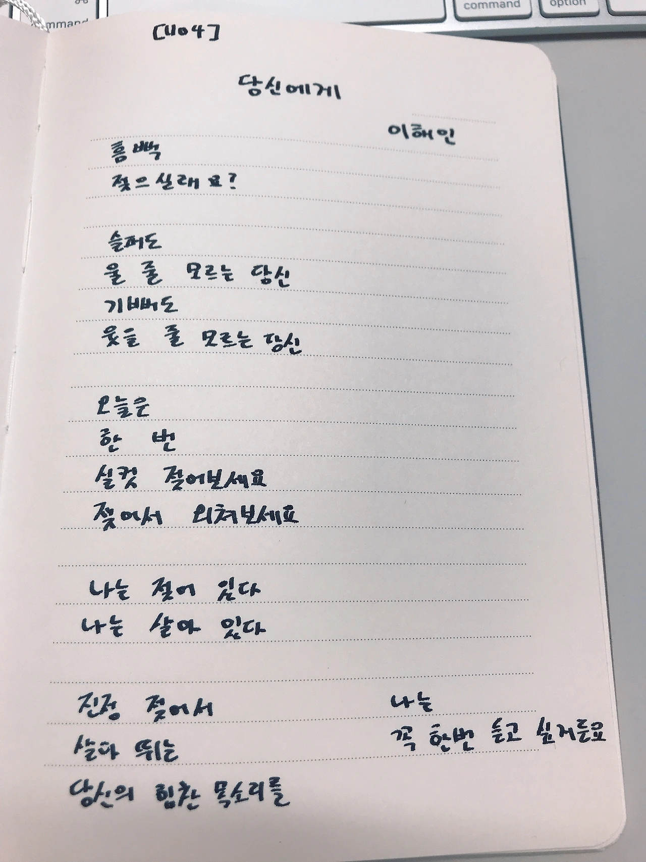 [1104] 당신에게 by이해인흠뻑젖으실래요? 슬퍼도울 줄 모르는 당신기뻐도웃을 줄 모르는 당신 오늘은한 번실컷 젖어보세요젖어서 외쳐보세요 나는 젖어 있다나는 살아 있다 진정 젖어서살아 뛰는당신의 힘찬 목소리를 나는꼭 한 번 듣고 싶거든요