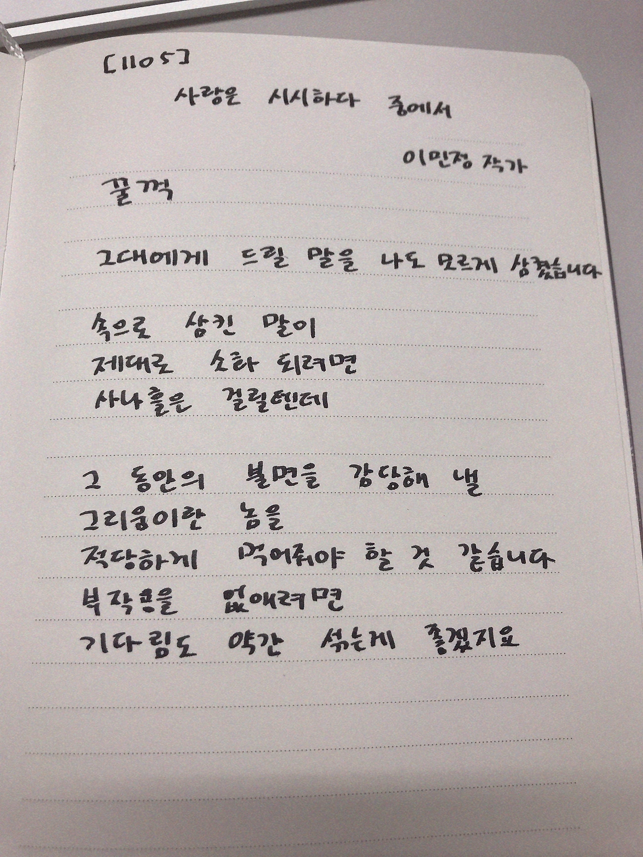 [1105] 이 민정 작가의 사랑은 시시하다 중에서 꿀꺽 그대에게 드릴 말을 나도 모르게 삼켰습니다 속으로 삼킨 말이제대로 소화 되려면사나흘은 걸릴 텐데 그 동안의 불면을 감당해 낼그리움이란 놈을적당하게 먹어줘야 할 것 같습니다부작용을 없애려면 기다림도 약간 섞는게 좋겠지요