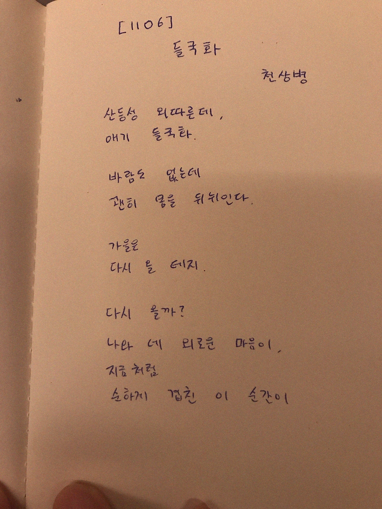 [1106] 들국화 by 천상병 산등선 외따른 데, 애기 들국화.바람도 없는데괜히 몸을 뒤뉘인다.가을은다시 올 테지. 다시 올까?나와 네 외로운 마음이, 지금처럼순하게 겹친 이 순간이