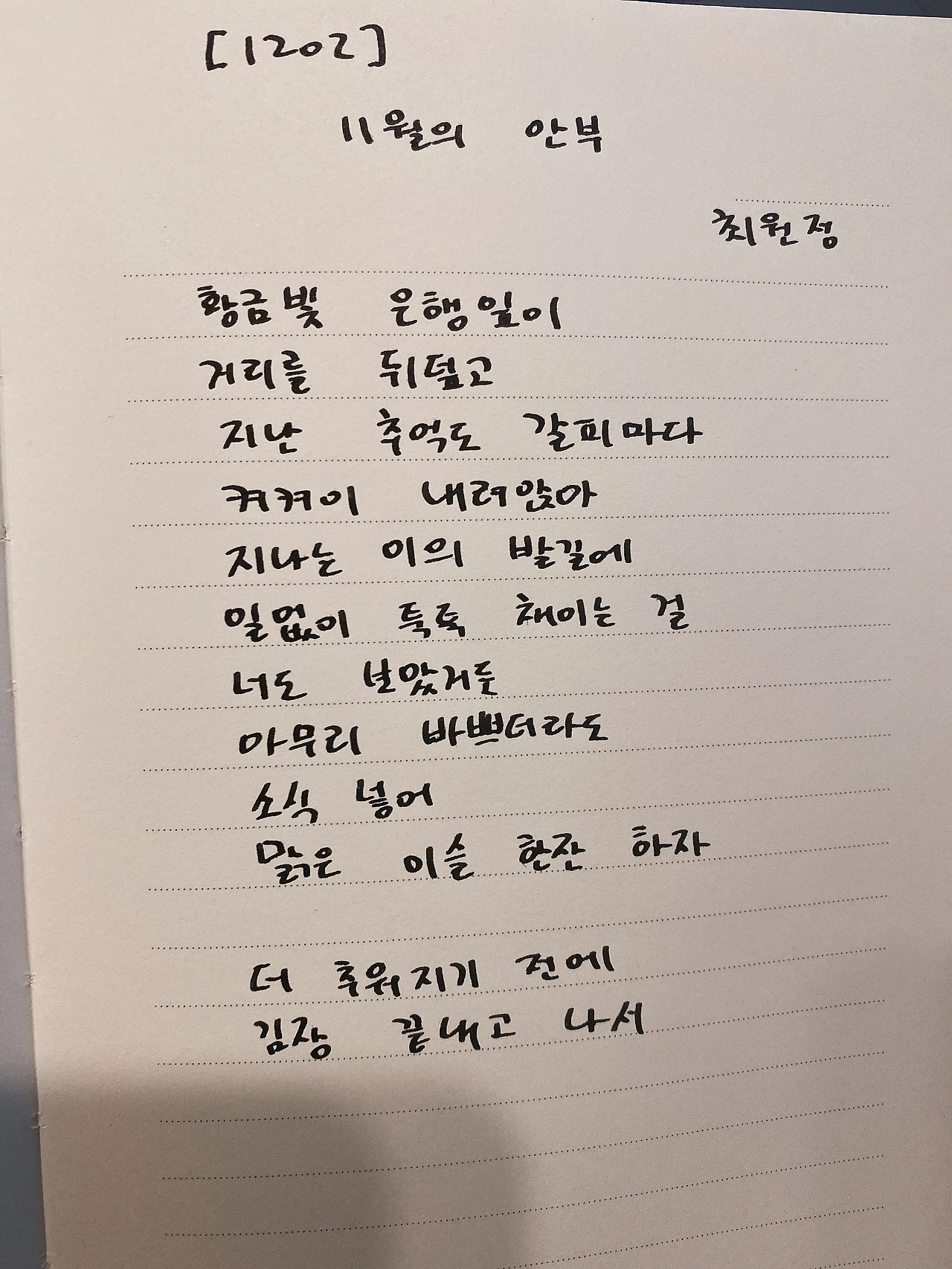 [1202] 11월의 안부 by 최원정황금빛 은행잎이 거리를 뒤덮고 지난 추억도 갈피마다 켜켜이 내려앉아 지나는 이의 발길에 일없이 툭툭 채이는 걸 너도 보았거든 아무리 바쁘더라도 소식 넣어 맑은 이슬 한 잔 하자 더 추워지기 전에 김장 끝내고 나서