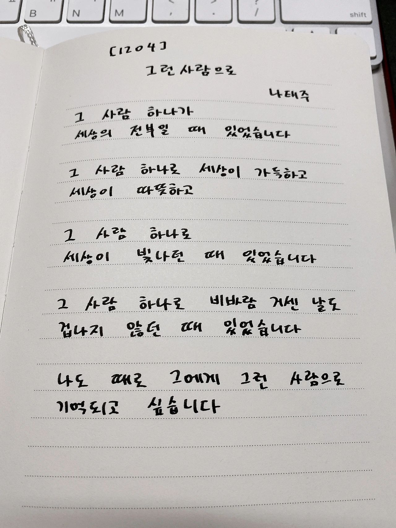 [1204] 그런사람으로 by 나태주그 사람 하나가세상의 전부일 때 있었습니다 그 사람 하나로 세상이 가득하고세상이 따뜻하고 그 사람 하나로세상이 빛나던 때 있었습니다 그 사람 하나로 비바람 거센 날도겁나지 않던 때 있었습니다 나도 때로 그에게 그런 사람으로기억되고 싶습니다