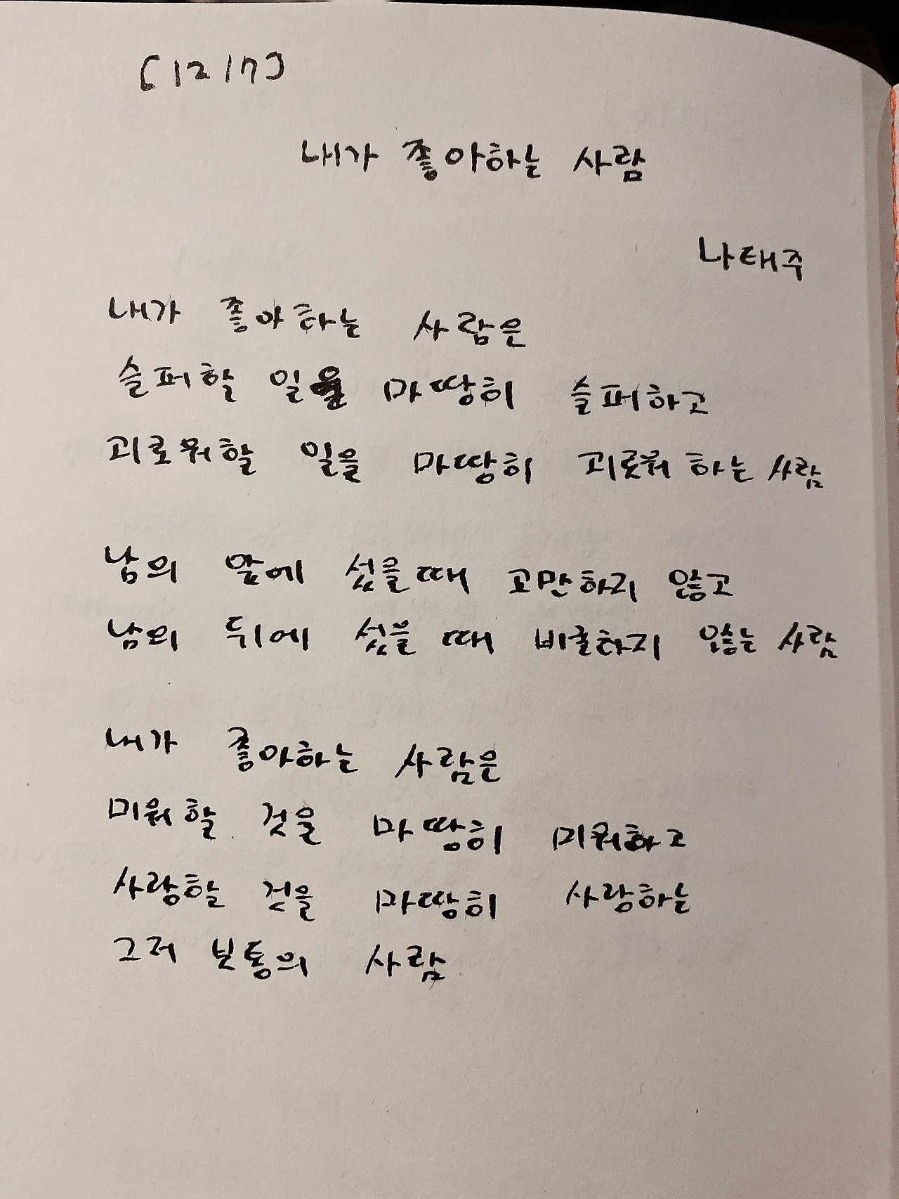 [1217] 내가 좋아하는 사람 by 나태주내가 좋아하는 사람은슬퍼할 일을 마땅히 슬퍼하고괴로워할 일을 마땅히 괴로워 하는 사람남의 앞에 섰을 때 교만하지 않고남의 뒤에 섰을 때 비굴하지 않는 사람내가 좋아하는 사람은미워할 것을 마땅히 미워하고사랑할 것을 마땅히 사랑하는그저 보통의 사람