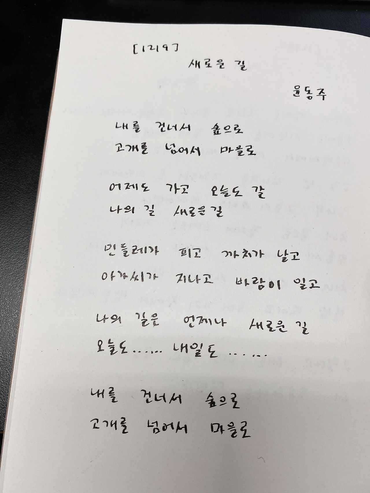 [1219] 새로운 길 by 윤동주 내를 건너서 숲으로고개를 넘어서 마을로 어제도 가고 오늘도 갈나의 길 새로운 길 민들레가 피고 까치가 날고아가씨가 지나고 바람이 일고 나의 길은 언제나 새로운 길오늘도…… 내일도…… 내를 건너서 숲으로고개를 넘어서 마을로