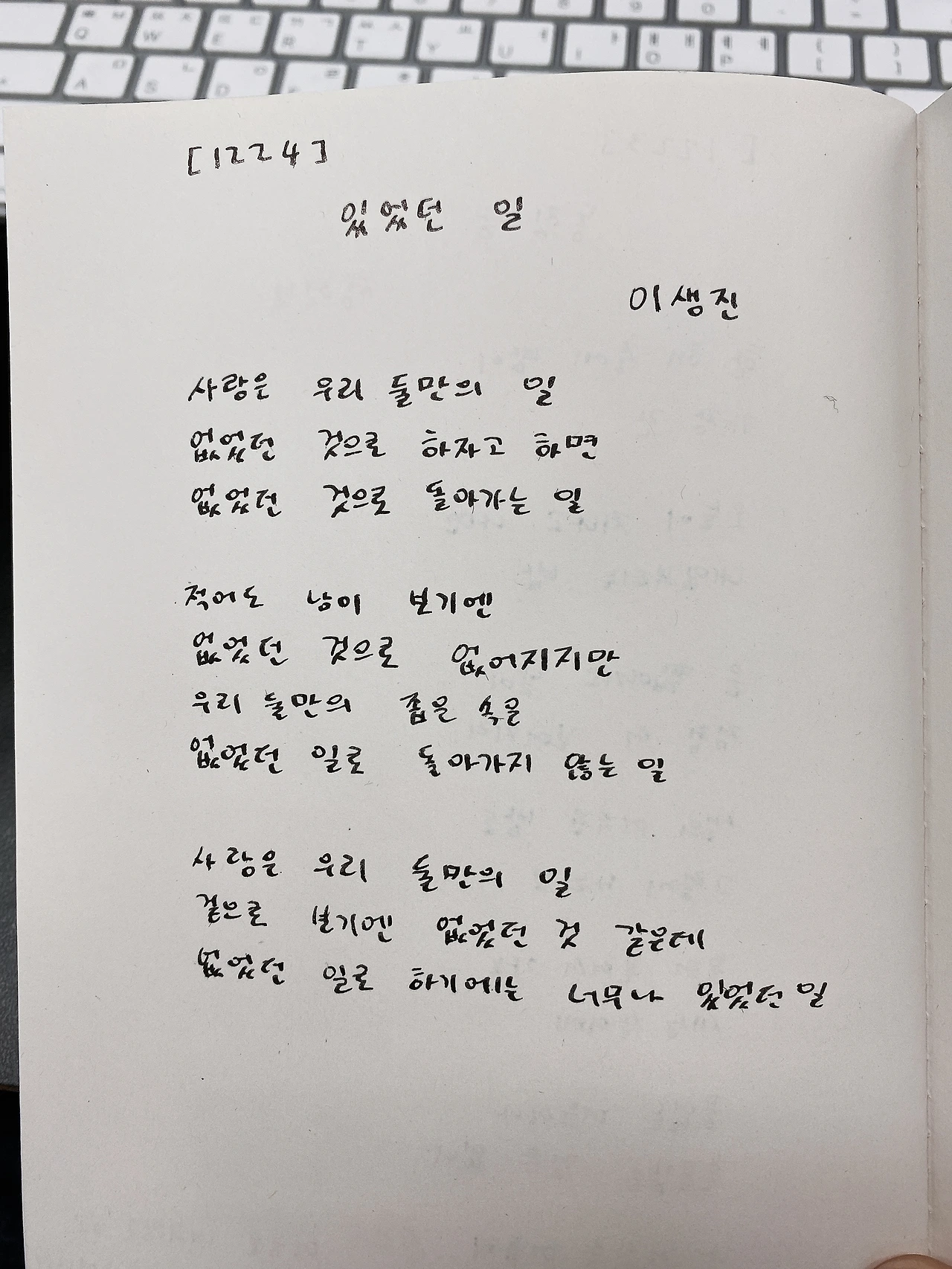 [1224] 있었던 일 by 이생진 사랑은 우리 둘만의 일없었던 것으로 하자고 하면없었던 것으로 돌아가는 일적어도 남이 보기엔없었던 것으로 없어지지만우리 둘만의 좁은 속은없었던 일로 돌아가지 않는 일사랑은 우리 둘만의 일겉으로 보기엔 없었던 것 같은데없었던 일로 하기에는 너무나 있었던 일