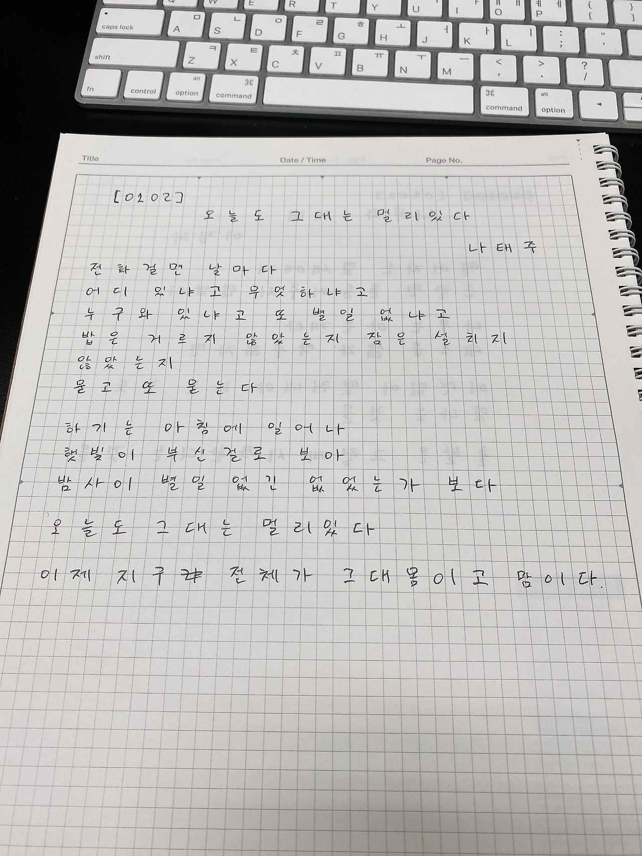 [0102] 오늘도 그대는 멀리 있다 by 나태주전화 걸면 날마다어디 있냐고 무엇하냐고누구와 있냐고 또 별일 없냐고밥은 거르지 않았는지 잠은 설치지 않았는지묻고 또 묻는다하기는 아침에 일어나햇빛이 부신 걸로 보아밤사이 별일 없긴 없었는가 보다오늘도 그대는 멀리 있다이제 지구 전체가 그대 몸이고 맘이다.