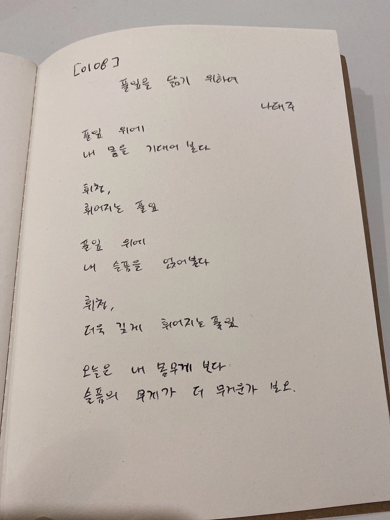[0108] 풀잎을 닮기 위하여 by 나태주풀잎 위에내 몸을 기대어본다휘청,휘어지는 풀잎풀잎 위에 내 슬픔을 얹어본다휘청,더욱 깊게 휘어지는 풀잎오늘은 내 몸무게보다슬픔의 무게가 더 무거운가 보오.