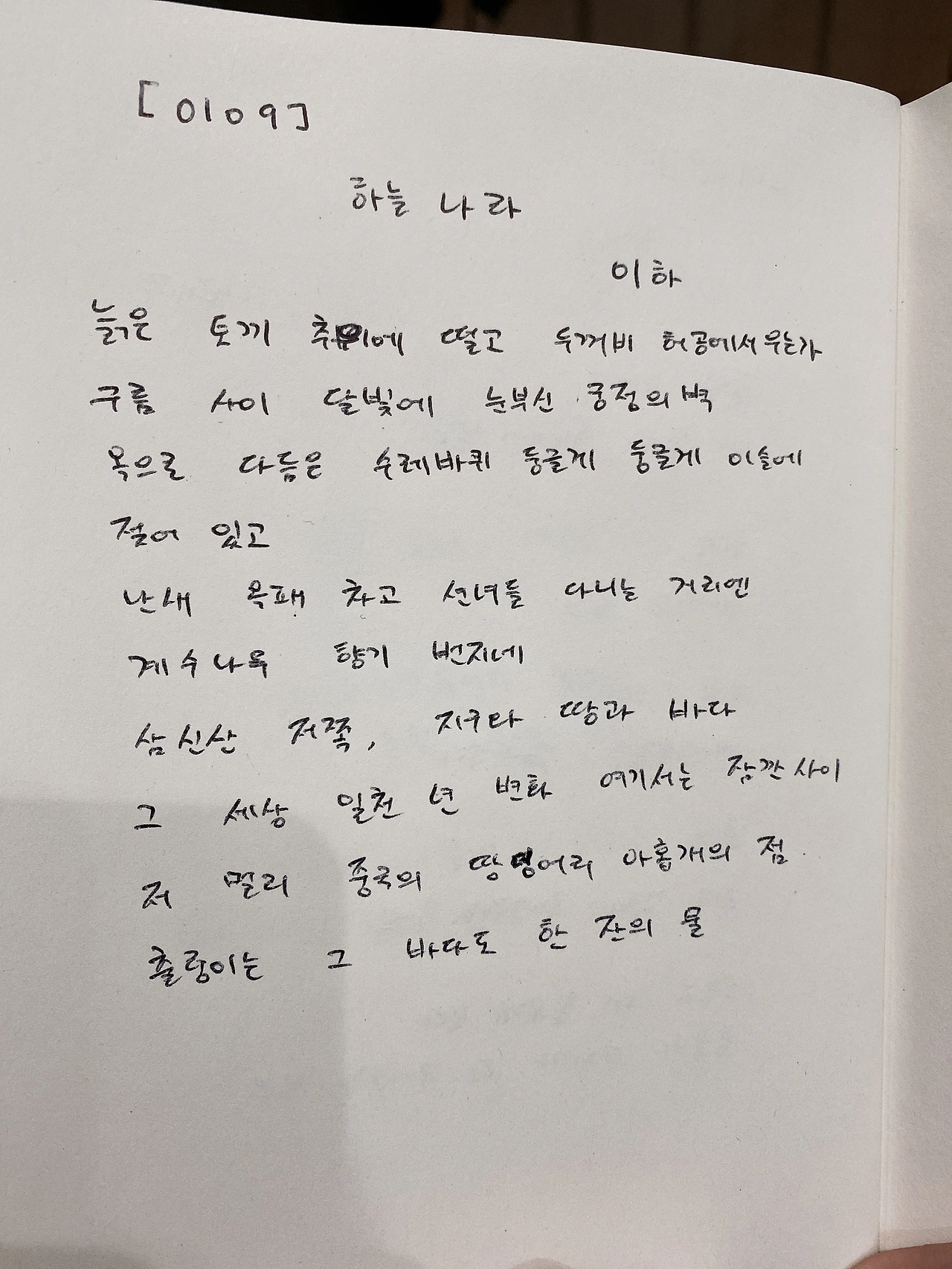 [0109] 하늘 나라 by 이하 (夢天 - 李賀)늙은 토끼 추위에 떨고 두꺼비 허공에서 우는가구름 사이 달빛에 눈부신 궁전의 벽옥으로 다듬은 수레바퀴 둥글게 둥글게 이슬에 젖어 있고난새 옥패 차고 선녀들 다니는 거리엔 계수나무 향기 번지네삼심산 저쪽, 지구의 땅과 바다그 세상 일천 년 변화 여기서는 잠깐 사이저 멀리 중국의 땅덩어리 아홉 개의 점출렁이는 그 바다도 한 잔의 물