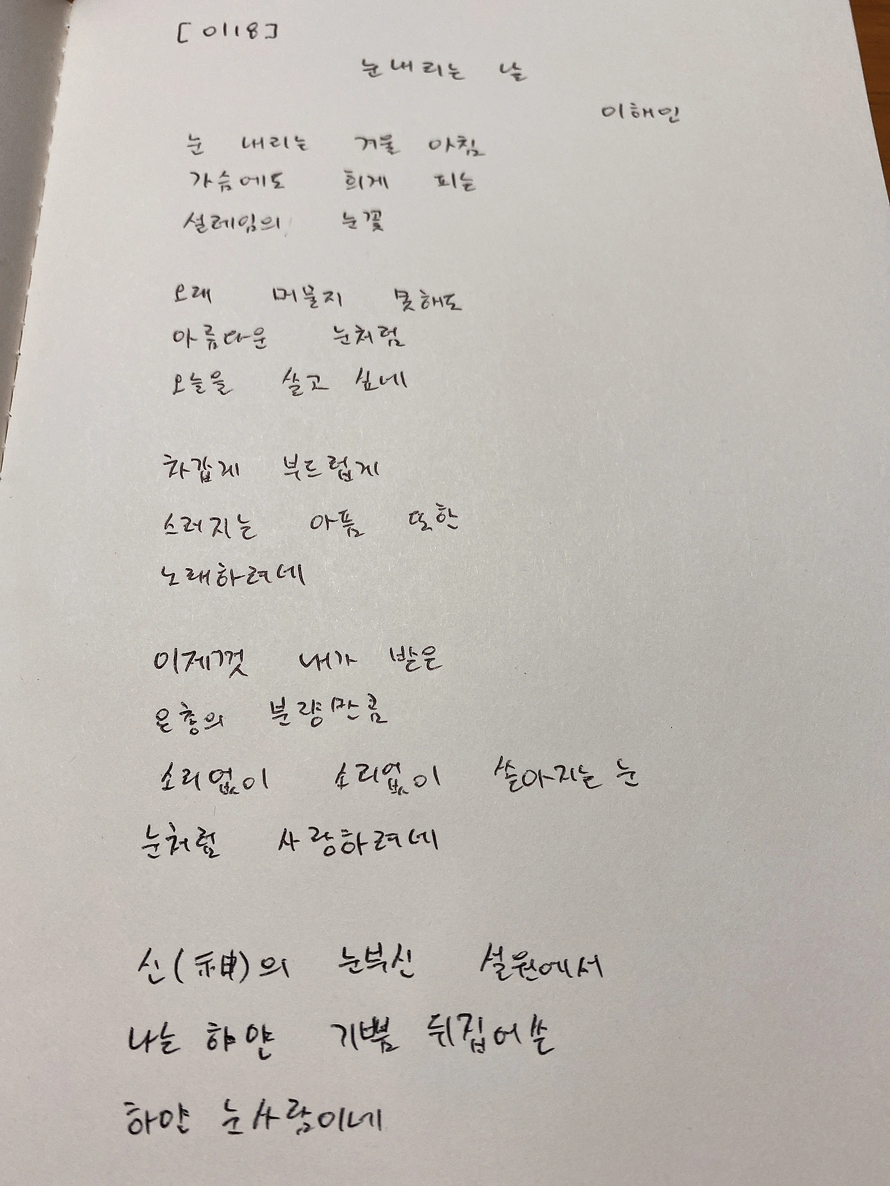 [0118] 눈 내리는 날 / 이해인시인눈 내리는 겨울 아침가슴에도 희게 피는설레임의 눈꽃 오래 머물지 못해도아름다운 눈처럼오늘을 살고 싶네 차갑게 부드럽게스러지는 아픔 또한노래하려네 이제껏 내가 받은은총의 분량만큼소리없이 소리없이 쏟아지는 눈눈처럼 사랑하려네 신(神)의 눈부신 설원에서나는 하얀 기쁨 뒤집어쓴하얀 눈사람이네