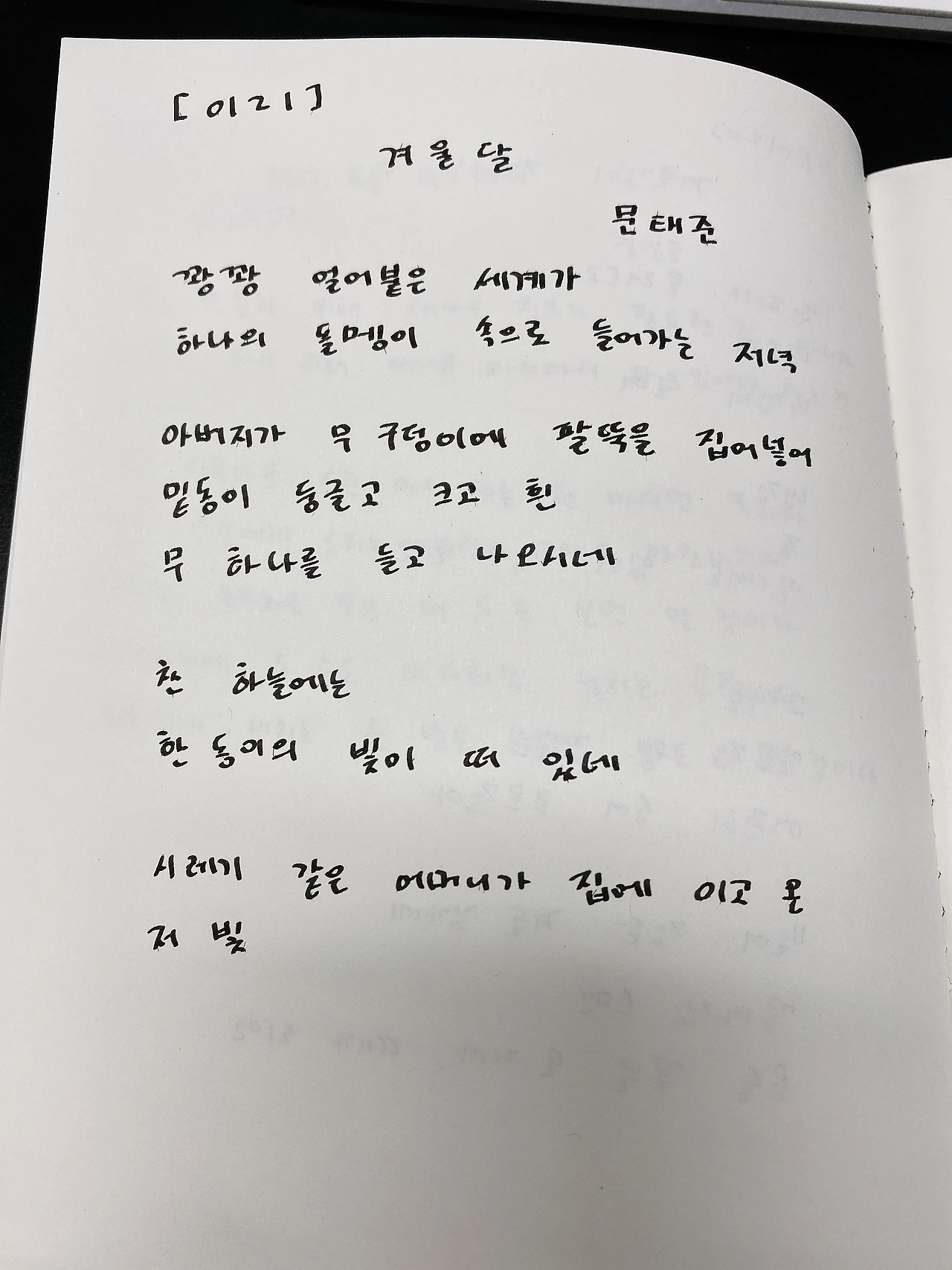 [0121] 겨울달 by 문태준꽝꽝 얼어붙은 세계가하나의 돌멩이 속으로 들어가는 저녁 아버지가 무 구덩이에 팔뚝을 집어넣어밑동이 둥글고 크고 흰무 하나를 들고 나오시네 찬 하늘에는한동이의 빛이 떠 있네 시레기 같은 어머니가 집에 이고 온저 빛