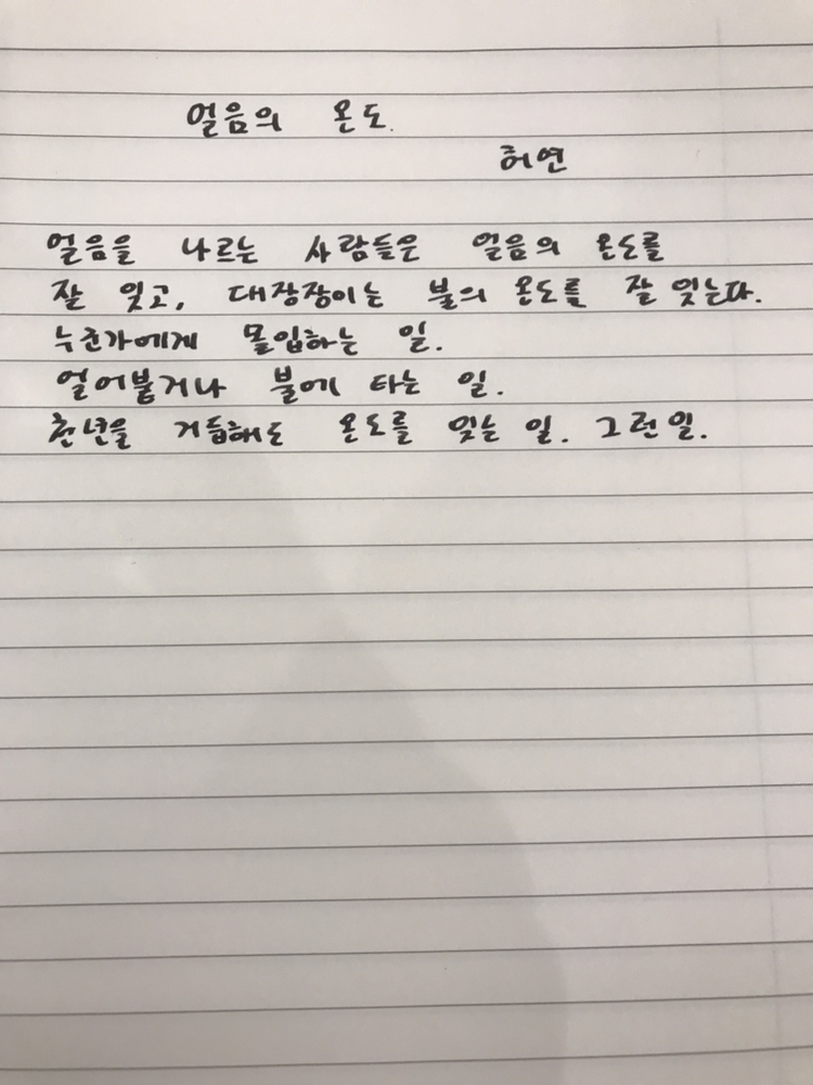 [1129] 029 얼음의 온도_허연얼음의 온도얼음을 나르는 사람들은 얼음의 온도를 잘 잊고, 대장장이는 불의 온도를 잘 잊는다. 누군가에게 몰입하는 일. 얼어붙거나 불에 타는 일. 천년을 거듭해도 온도를 잊는 일. 그런 일. 허연의 시집 <내가 원하는 천사> 중