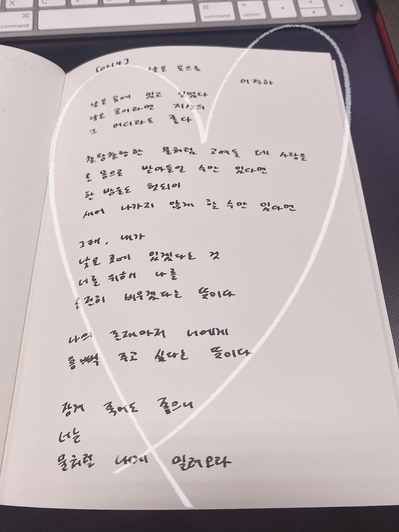 [0214] 낮은곳으로 by 이정하낮은곳에 있고 싶었다낮은 곳이라면 지상의 그 어디라도 좋다찰랑찰랑한 물처럼 고여들 네 사랑을온 몸으로 받아들일 수만 있다면 한 방울도 헛되이새어 나가지 않게 할 수만 있다면 그래, 내가낮은 곳에 있겠다는 건너를 위해 나를온전히 비우겠다는 뜻이다 나의 존재마저 너에게 흠뻑 주고 싶다는 뜻이다잠겨 죽어도 좋으니너는물처럼 내게 밀려오라