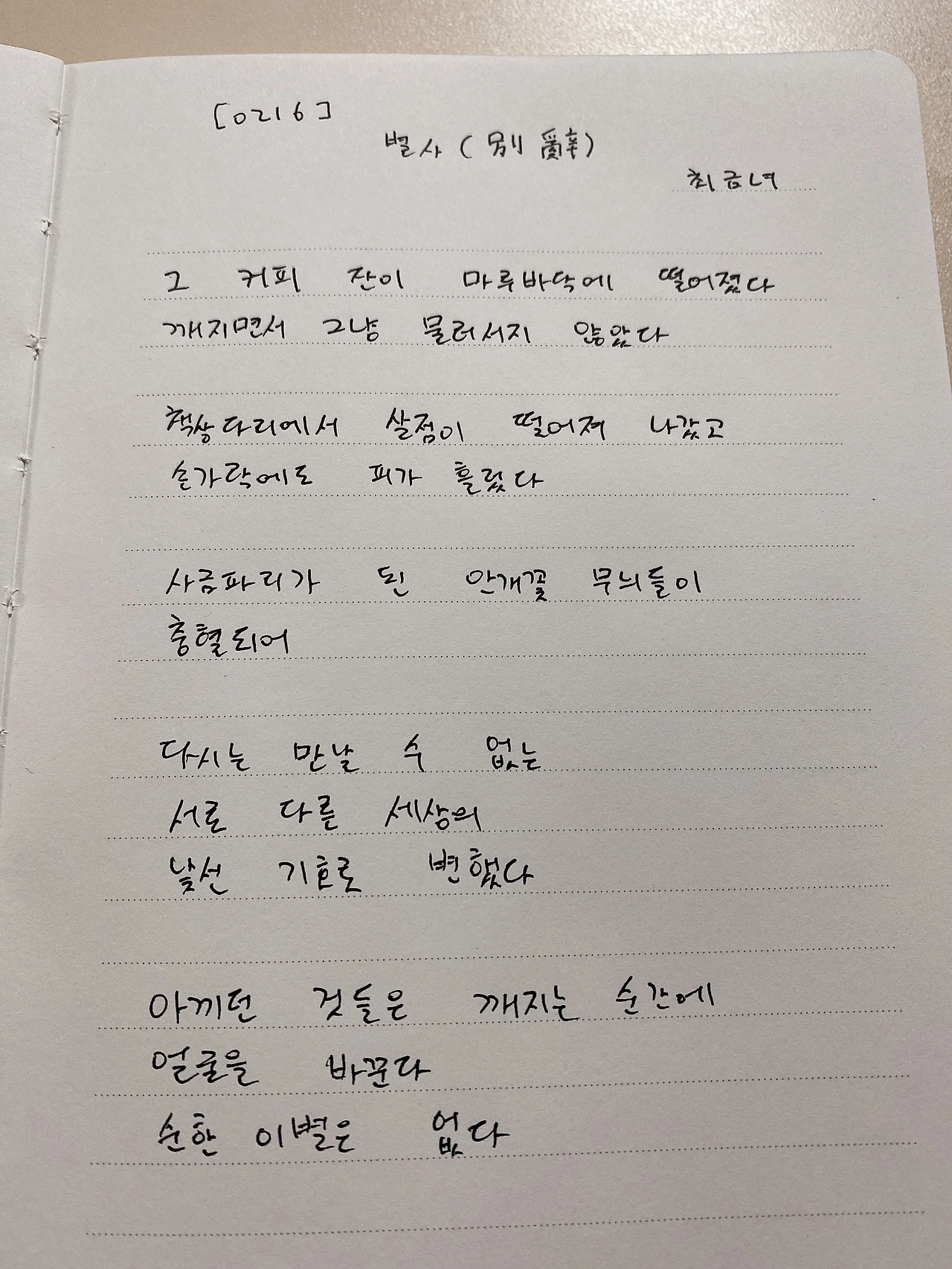 [0216] 별사(別辭) - 최금녀그 커피 잔이 마루바닥에 떨어졌다깨지면서 그냥 물러서지 않았다책상다리에서 살점이 떨어져 나갔고손가락에서도 피가 흘렀다사금파리가 된 안개꽃 무늬들이충혈되어다시는 만날 수 없는서로 다른 세상의낯선 기호로 변했다아끼던 것들은 깨지는 순간에얼굴을 바꾼다순한 이별은 없다