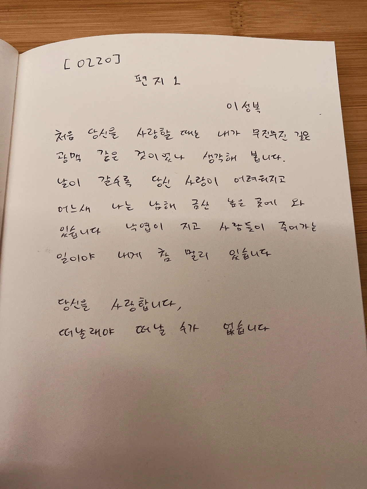 [0220] 편지 1 / 이성복처음 당신을 사랑할 때는 내가 무진무진 깊은 광맥 같은 것이었나 생각해 봅니다 날이 갈수록 당신 사랑이 어려워지고 어느새 나는 남해 금산 높은 곳에 와 있습니다 낙엽이 지고 사람들이 죽어가는 일이야 내게 참 멀리 있습니다 당신을 사랑합니다, 떠날래야 떠날 수가 없습니다