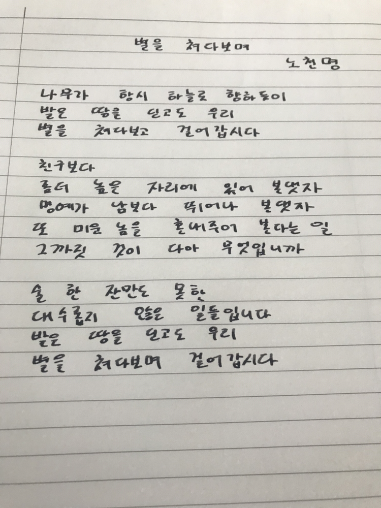 별을 쳐다보며 - 노천명나무가 항시 하늘로 향하듯이발은 땅을 딛고도 우리별을 쳐다보고 걸어갑시다친구보다좀더 높은 자리에 있어 본댓자명예가 남보다 뛰어나 본댓자또 미운 놈을 혼내주어 본다는 일그까짓 것이 다아 무엇입니까술 한 잔만도 못한대수롭지 않은 일들입니다발은 땅을 딛고도 우리별을 쳐다보며 걸어갑시다