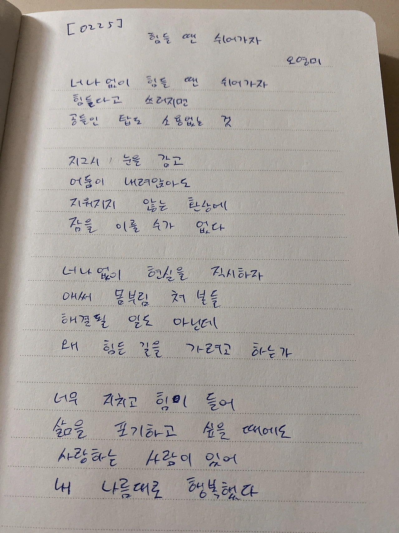 [0225] 힘들 땐 쉬어가자 / 오영미너나없이 힘들 땐 쉬어 가자힘들다고 쓰러지면공들인 탑도 소용없는 것지그시 눈을 감고어둠이 내려앉아도지워지지 않는 환상에잠을 이룰 수가 없다너나없이 현실을 직시하자애써 몸부림 쳐 본들해결될 일도 아닌데왜 힘든 길을 가려고 하는가너무 지치고 힘이 들어삶을 포기하고 싶을 때에도사랑하는 사람이 있어내 나름대로 행복했다