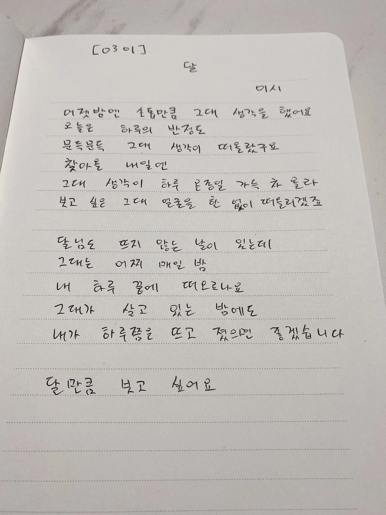 [0301] 달 / 이시어젯밤엔 손톱만큼 그대 생각을 했어요오늘은 하루의 반 정도문득문득 그대 생각이 떠올랐구요찾아올 내일엔그대 생각이 하루 온종일 가득 차 올라보고 싶은 그대 얼굴을 한 없이 떠올리겠죠달님도 뜨지 않는 날이 있는데그대는 어찌 매일 밤내 하루 끝에 떠오르나요그대가 살고 있는 밤에도내가 하루쯤은 뜨고 졌으면 좋겠습니다달만큼 보고 싶어요
